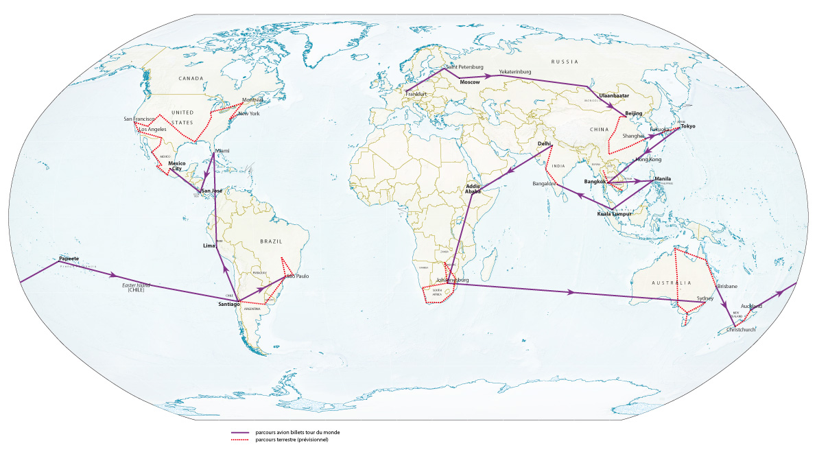- 12/5 au 7/7 : arrivée à Sao Paolo pour un long parcours terrestre en Amérique du Sud avec au programme : le Brésil, l’Uruguay, l’Argentine et le Chili.