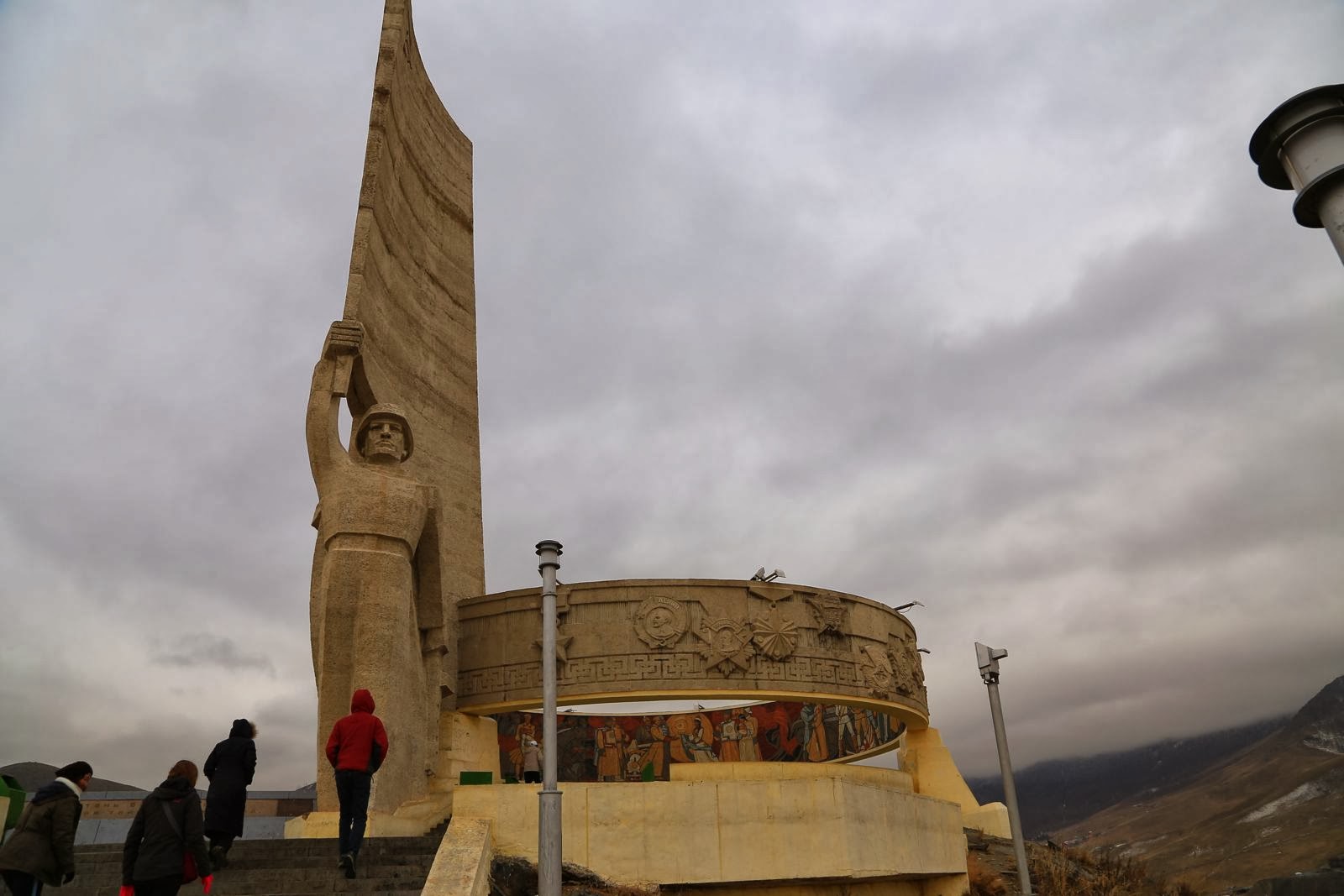 Après 30 min de bouchon, on a réussi à atteindre un mémorial en l’honneur de la collaboration russo-mongole. Une gigantesque fresque en mosaïque représentait les grandes victoires de l’histoire ainsi que des messages de paix et de fraternité entre les 2 pays. Le monument est sur les hauteurs de la ville et offre un point de vue imprenable sur………… la laideur de la ville !! Partout il y a des tours d’immeuble en construction et les conditions météo ne mettent pas en valeur le paysage. Oulan-Bator est une ville avec une urbanisation galopante, un eldorador pour des enfants de paysans qui abandonnent leur campagne pour mieux gagner leur vie et s’offrir une vraie maison, lassés de dormir sous la yourte familiale.