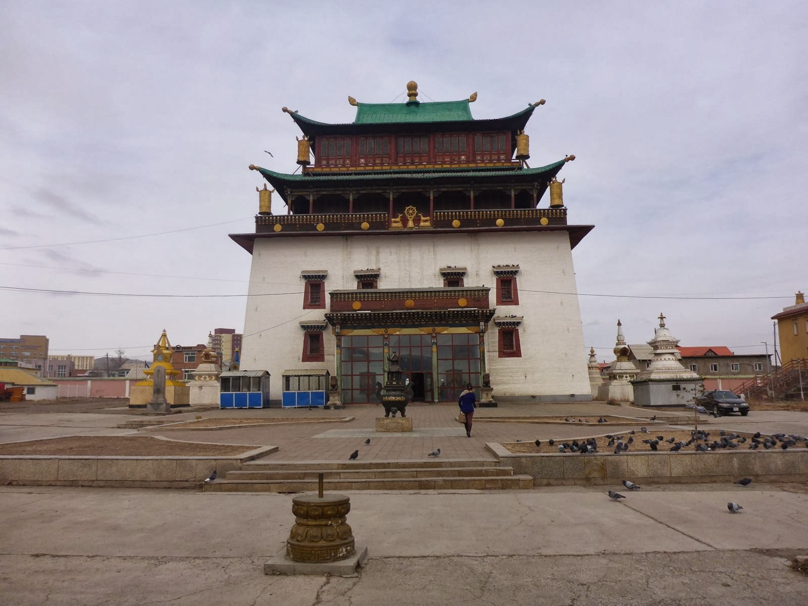 La ville n’a pas vraiment de grand intérêt touristique à part le monastère bouddhiste Gandantegchinlin de style tibétain que nous avons rejoint après 1h de marche dans l’air glacial et pollué, dans lequel se trouve une statue géante dorée de 20 tonnes et 26,5 m de haut. Notre guide a essayé de nous initier au rituel bouddhiste et nous l’avons suivie dans un parcours circulaire autour de la colossale statue qui consiste à faire tourner des centaines de cylindres dorés et gravés. Face à eux, il y a également près de 2000 icônes toutes différentes d’une trentaine de cm disposées dans une monumentale vitrine d’au moins 7 mètres de haut et qui occupe toute la largeur de deux côtés du temple. En plein parcours, certains pratiquants s’arrêtent pour se tourner vers l’une des icônes et faire une prière ou mettre de l’argent.