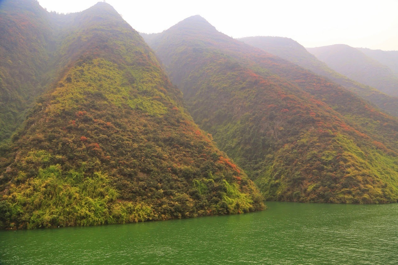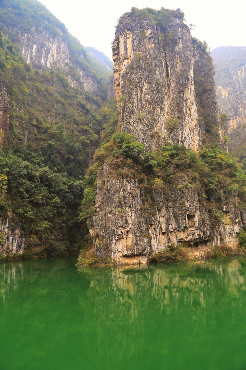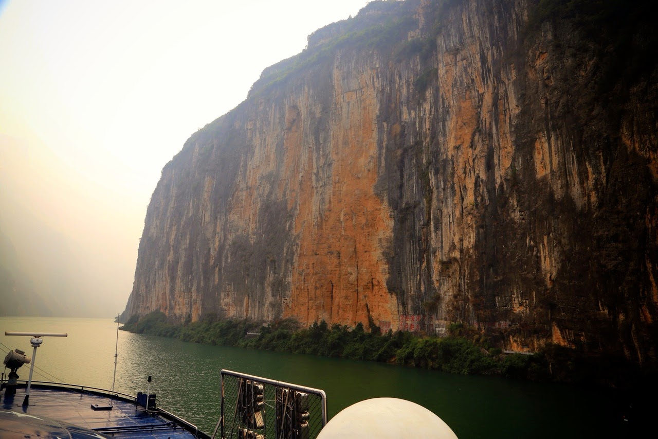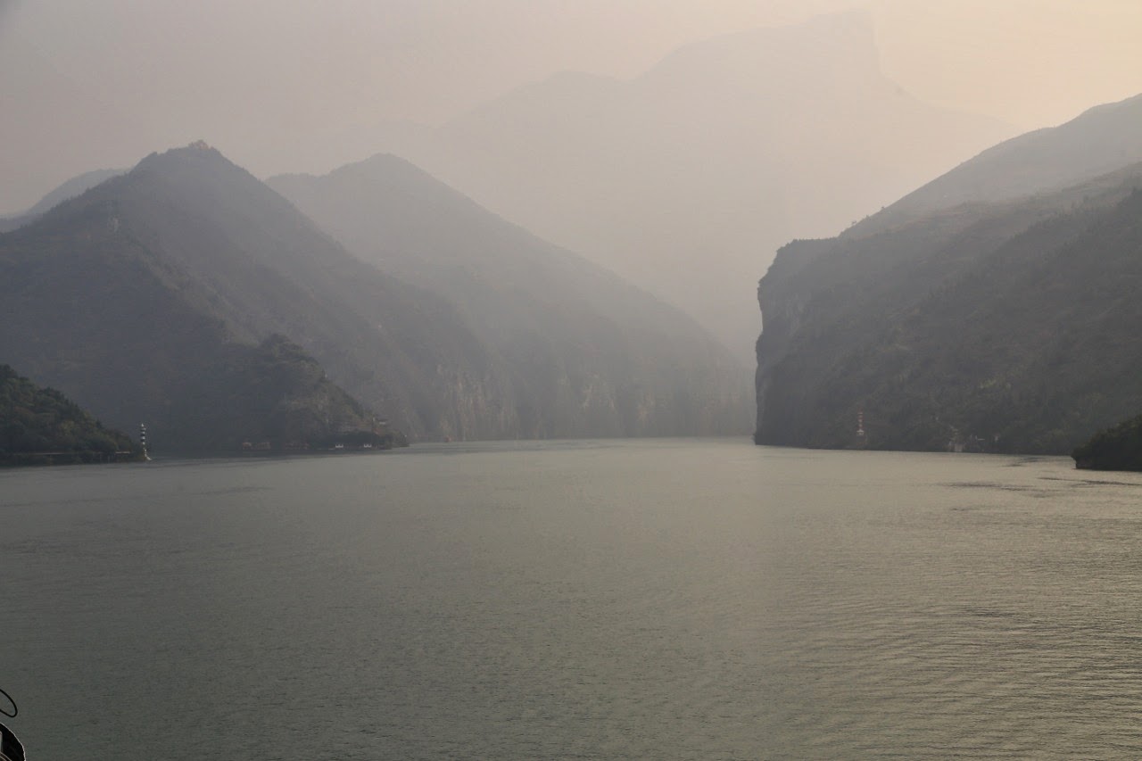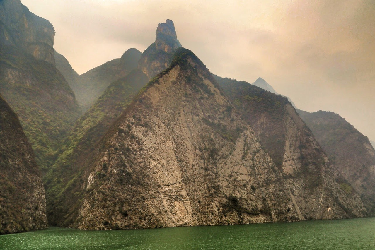 Le lendemain, le bateau avait atteint la gorge de Qutang, première des trois gorges et la plus impressionnante avec ses falaises vertigineuses se jetant dans le Yangzi. Comme souvent dans la région, le ciel était assez voilé et je suis “gâché“ car mes photos sont dégueulasses même en poussant la saturation et le contraste. Dès qu’il y a un rayon de soleil, je me console avec la couleur du fleuve que j’arrive à sortir avec un vert émeraude grâce à la végétation parfois luxuriante qui habille les parois. Les falaises découpées à la hache dévoilent des strates de roches qui ressortent dans un mélange de gris, de jaune et d’orange. Malgré la brume accrochée aux cimes et le vent qui fouette le visage, le spectacle est grandiose et on reste réellement impressionné par cette traversée qui s’étend sur 8 km.
