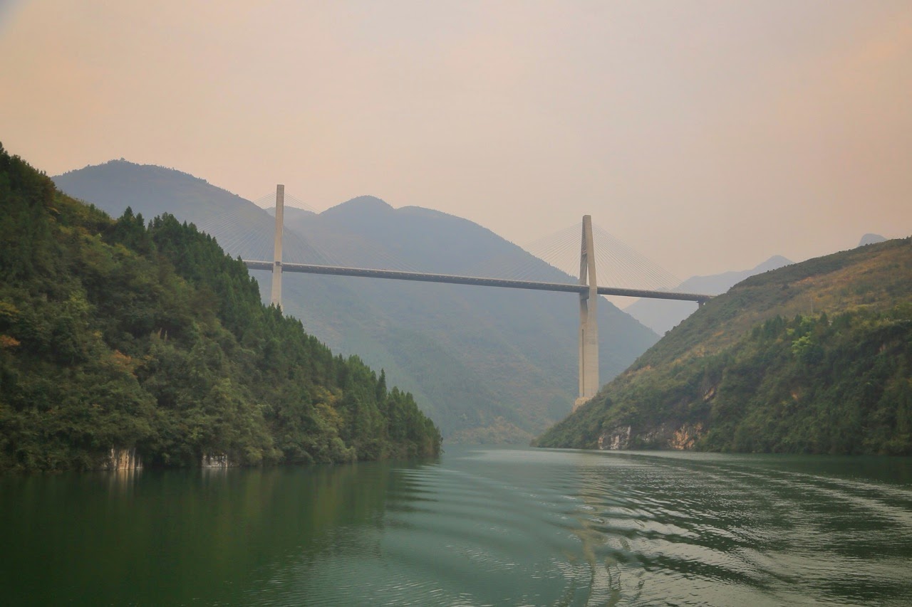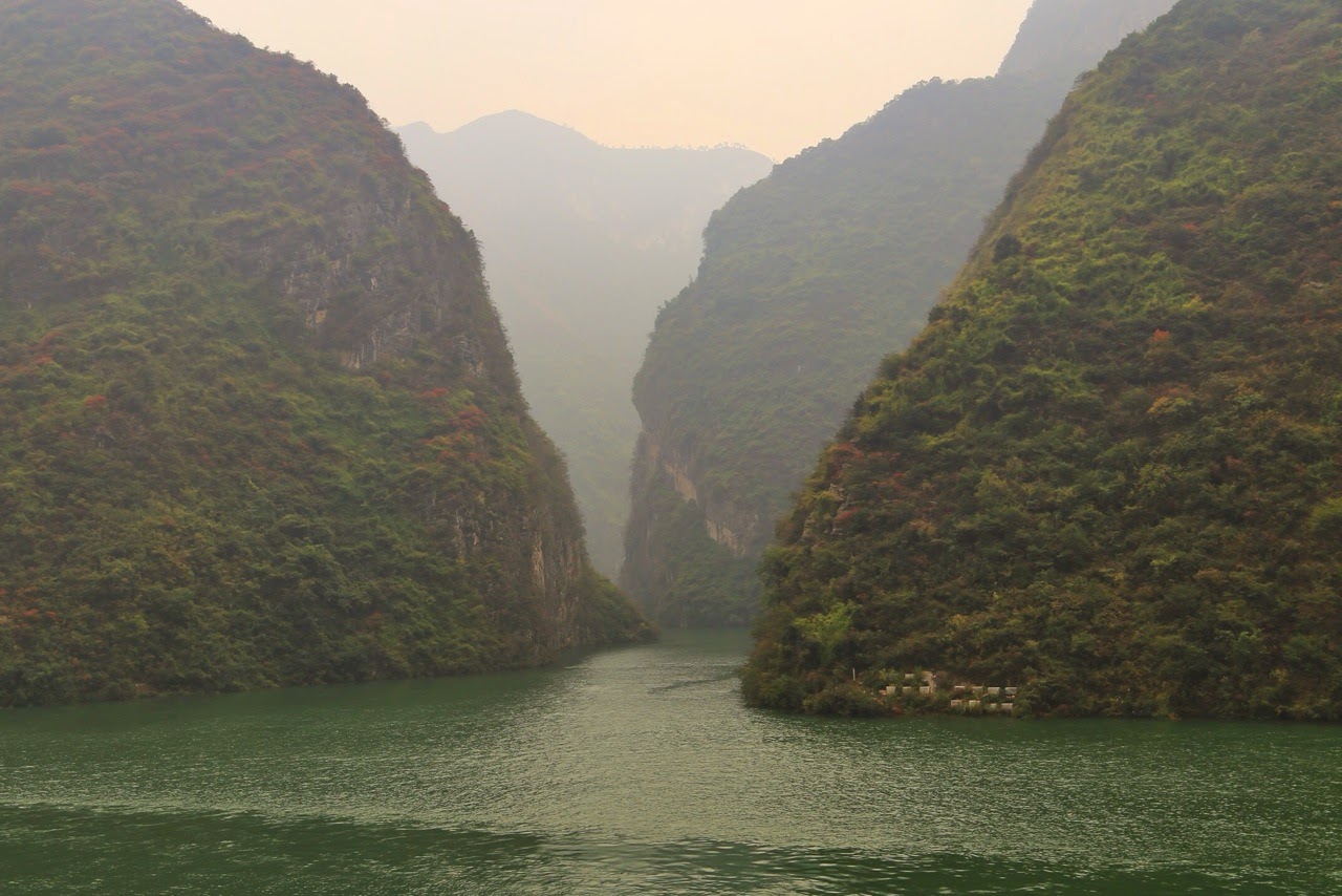 Le bateau passe devant Wushanpour ensuite attaquer la gorge de Wu(ou gorge des sorcières) qui offre un panorama tout aussi magnifique durant 40 km avec un mélange de pics vertigineux et de pentes verdoyantes dans lesquelles on débusque parfois une maison ou un pavillon rouge. A travers la brume, on peut distinguer le pic de la Déesseet celui des Immortels. Je shoote comme un dératé en changeant tous les réglages, l’exposition… mais rien y fait, sur chaque cliché je retrouve toujours ce foutu fond grisâtre qui fait disparaître le relief des montagnes dans un anthracite uniforme et délavé !Après les gorges, le Victoria Selena s’arrête à Badong pour nous débarquer afin d’emprunter de plus petits bateaux et nous engouffrer dans de petites gorges très pittoresques sur la rivière Shennong. Cet affluent est un modèle réduit des gorges du Yangzi mais l’étroitesse du sinueux “ruisseau“ et la proximité des falaises rendent la promenade assez impressionnante surtout lorsque quelques grottes, formations rocheuses et autres ponts de la future autoroute Shanghai-Chengdu viennent rompre la “presque“ monotonie des collines luxuriantes.