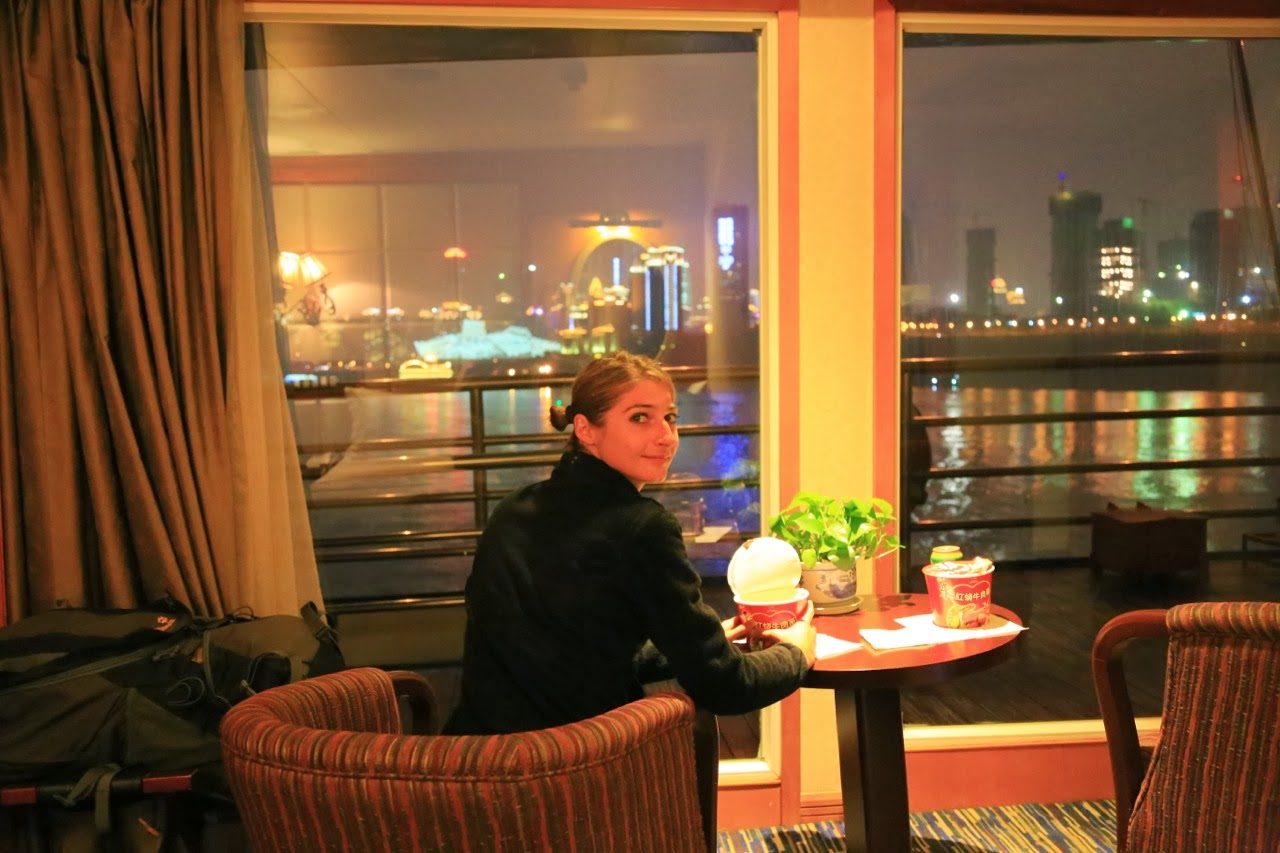 Vers 21h, le bateau a quitté la berge et c’est devant le spectacle de la ville et ses lumières que nous avons dégusté nos bols de nouilles chinoises achetés à l’épicerie du coin juste avant d’embarquer. Après le repas, on s’est couché, on a éteint les lumières et on a laissé tous les rideaux grands ouverts pour contempler la vue comme des gosses en attendant que le sommeil nous gagne !