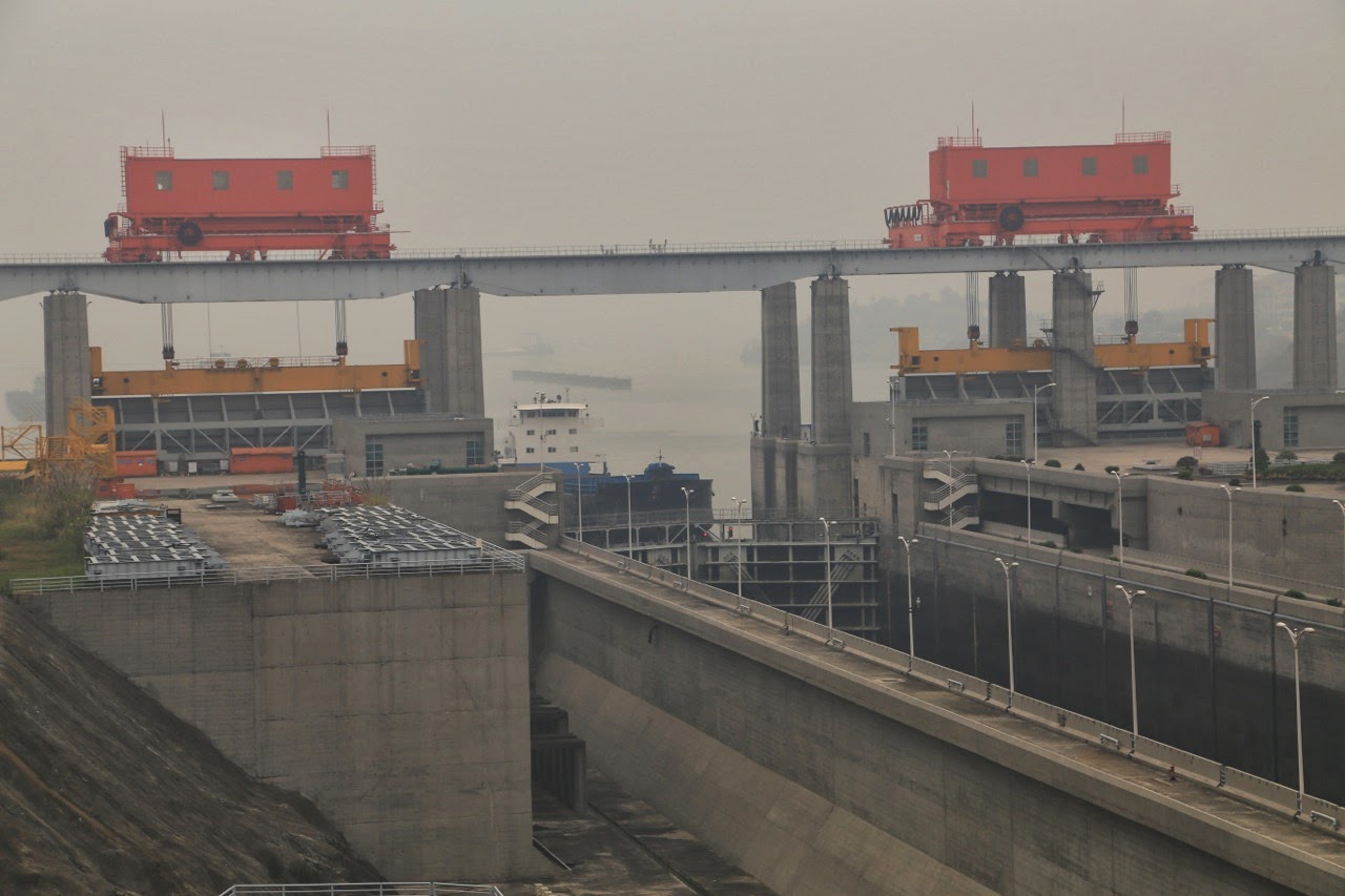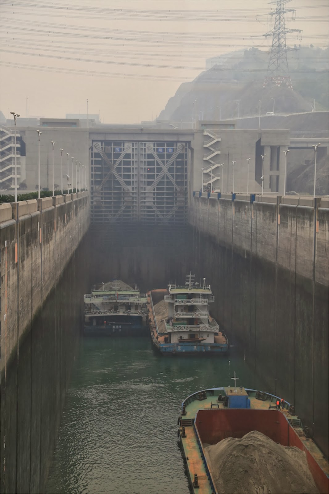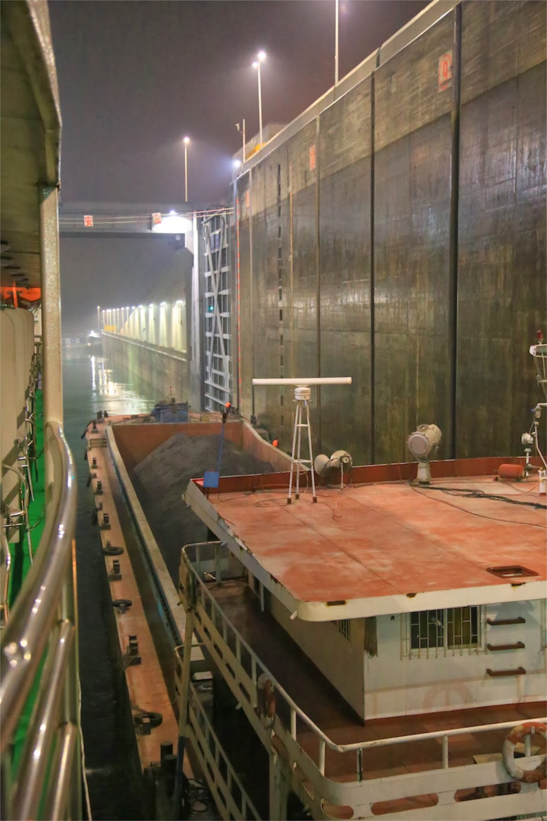 Je gravis l’escalier devant notre baie vitrée qui m’amène directement au dernier pont et à sa terrasse offrant une vue à 360°. Ce n’est qu’à ce moment-là que je réalise vraiment notre position et mes yeux désormais grands ouverts, je reste médusé par le spectacle exceptionnel auquel j’assiste. Derrière nous, le bateau de “seulement“ 4 ponts fait figure de petit yacht de plaisance coincé dans l’énorme structure de béton. Idem pour le cargo rempli de charbon arrimé juste à côté de nous qui passe pour une péniche ridicule !