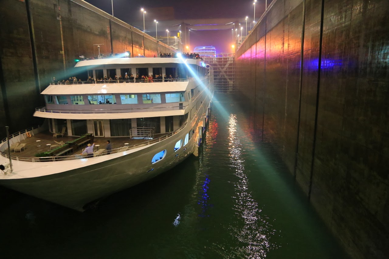 Vers 0h45, réveillé par le bruit des moteurs et des faisceaux lumineux qui balayaient la cabine, je me suis précipité pour ouvrir les rideaux. La première image m’a quelque peu “paniqué“ car sur l’instant je ne distingue à travers la vitre qu’un interminable sarcophage de béton me renvoyant à des cauchemars claustrophobes de ma tendre enfance. Mon cerveau à peine sorti d’un premier sommeil a totalement oublié cette histoire d’écluses et ne comprend pas quelle structure peut contenir un navire de 6 étages et de 5000 tonnes ! Je me dirige vers la baie vitrée qui donne sur l’arrière du bateau et mes yeux sont totalement illuminés par des projecteurs pointant vers notre direction. Là aussi, ça fait bizarre sur le coup et encore “choqué“ par le mur de béton, je mets une seconde à réaliser que c’est un bateau à quelques mètres du nôtre qui “partage“ la même écluse ! Je saisis au vol mon appareil photo, un jean et ma polaire pour sortir de la cabine et observer ce spectacle ahurissant avec pour fond sonore le vacarme des moteurs au ralenti.