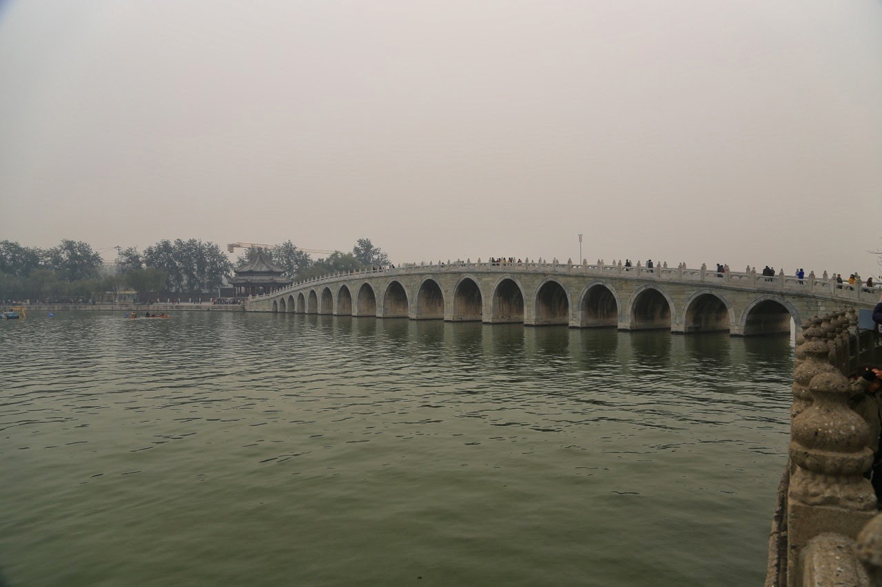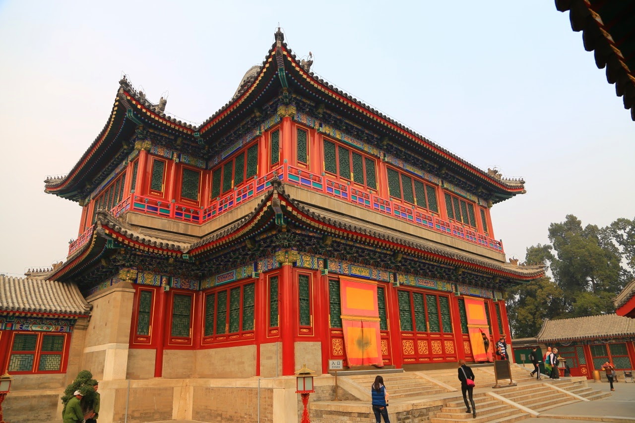 La guide de la veille nous avait pourtant prévenus, le Palais d’été (situé à 15 km du centre) s’étend sur une surface 4 fois plus grande que la Cité Interdite !! Mais comme nous avions eu un bon entraînement, nous étions affutés pour explorer ce qui constituait un gigantesque terrain de jeu pour la cour impériale ! D’ailleurs tout de suite après la porte nord par laquelle nous sommes rentrés, le ton est donné : le Pavillon des Fragrances bouddhiques est tout en haut d’une colline avec plusieurs escaliers à parcourir. Mais d’abord on s’est arrêté sur un pont, le temps d’admirer la rue Suzhou, composée de petits commerces bordant un canal pouvant faire penser à une “Venise pékinoise“. En réalité, cette rue était le caprice d’un empereur qui adorait la ville de Jiangsu et qui en souhaitait une (mini) reconstitution pour le Palais d’été !