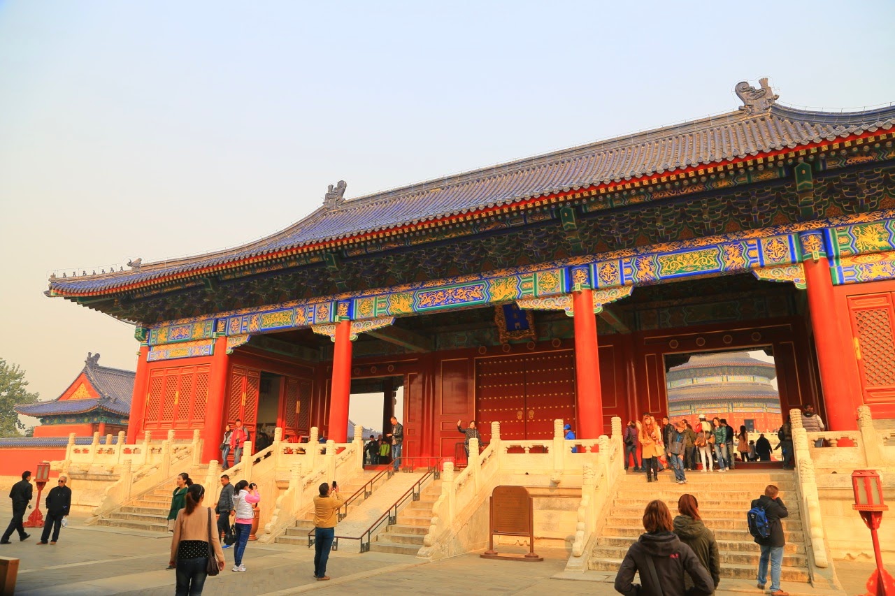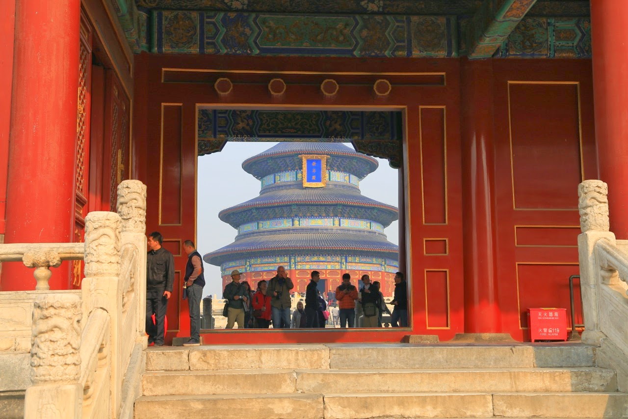 Le Temple du Ciel est un énorme parc de 267 ha où les Chinois aiment se retrouver pour se promener, danser, faire du yoga, jouer aux échecs ou au aki (sorte de gros volant de badminton avec lequel on jongle avec les pieds et on se fait des passes sans qu’il touche le sol). Surtout en cette journée de dimanche, les lieux ne manquaient pas d’activité et on est loin des temples avec ses fidèles et leurs bâtons d’encens ! On en oublierait presque les portes et les monuments qu’on traverse, où l’empereur célébrait des rites ancestraux afin de solliciter la clémence divine et une bonne moisson. Les enceintes et les temples sont parfaitement ordonnés et symétriques, le temple principal est rond sur des bases carrées tout comme l’autel du Tertre circulaire composé de 3 terrasses en marbre blanc dans une enceinte carrée.