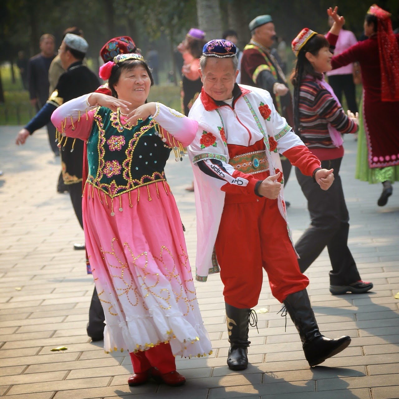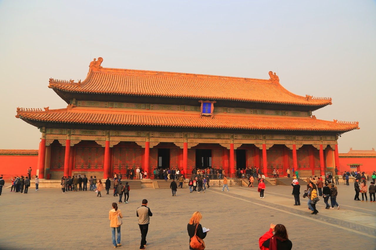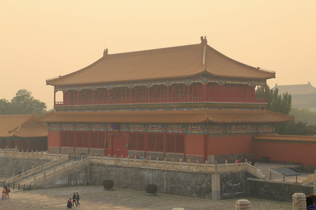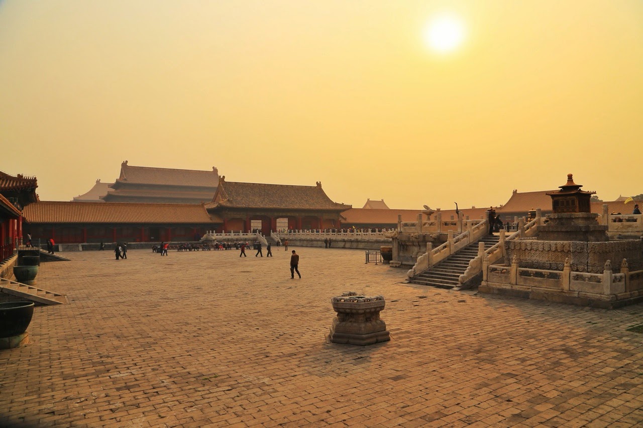 Le Temple du Ciel est un énorme parc de 267 ha où les Chinois aiment se retrouver pour se promener, danser, faire du yoga, jouer aux échecs ou au aki (sorte de gros volant de badminton avec lequel on jongle avec les pieds et on se fait des passes sans qu’il touche le sol). Surtout en cette journée de dimanche, les lieux ne manquaient pas d’activité et on est loin des temples avec ses fidèles et leurs bâtons d’encens ! On en oublierait presque les portes et les monuments qu’on traverse, où l’empereur célébrait des rites ancestraux afin de solliciter la clémence divine et une bonne moisson. Les enceintes et les temples sont parfaitement ordonnés et symétriques, le temple principal est rond sur des bases carrées tout comme l’autel du Tertre circulaire composé de 3 terrasses en marbre blanc dans une enceinte carrée.