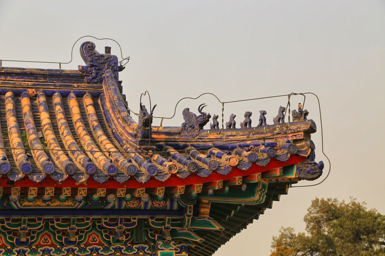 Les tuiles des toits et des murs sont bleues pour symboliser le ciel et on apprend que les escaliers ont 9 marches, le plus grand chiffre (impair) céleste censé favoriser la volonté divine… toujours ! En suivant le rite de l’empereur, on traverse une longue esplanade qui révèle être un pont car il y a des passages au-dessous pour laisser passer les animaux.