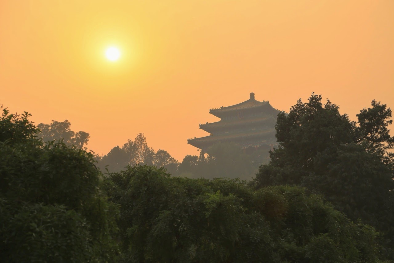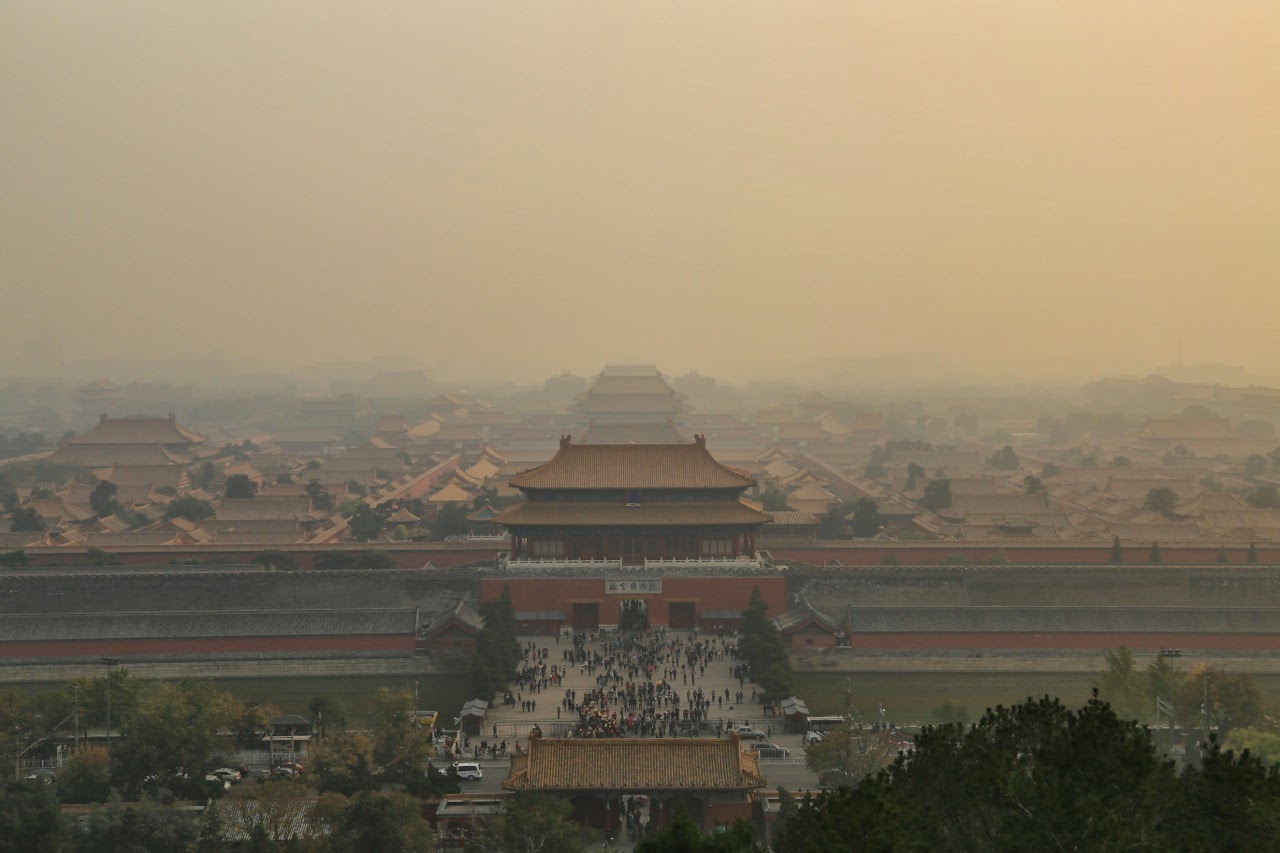 Armés d’encore un peu de courage, nous sommes montés sur la colline surplombant la Cité Interdite, nous lançant dans la traversée du parc Jingshan qui protège le Palais impérial des mauvais esprits !! En fait, la colline est tout à fait artificiel créée jadis avec les remblais provenant du creusement des douves du Palais! Nos efforts n’ont pas été vains et arrivés au sommet, on peut découvrir une vue magnifique de la capitale.