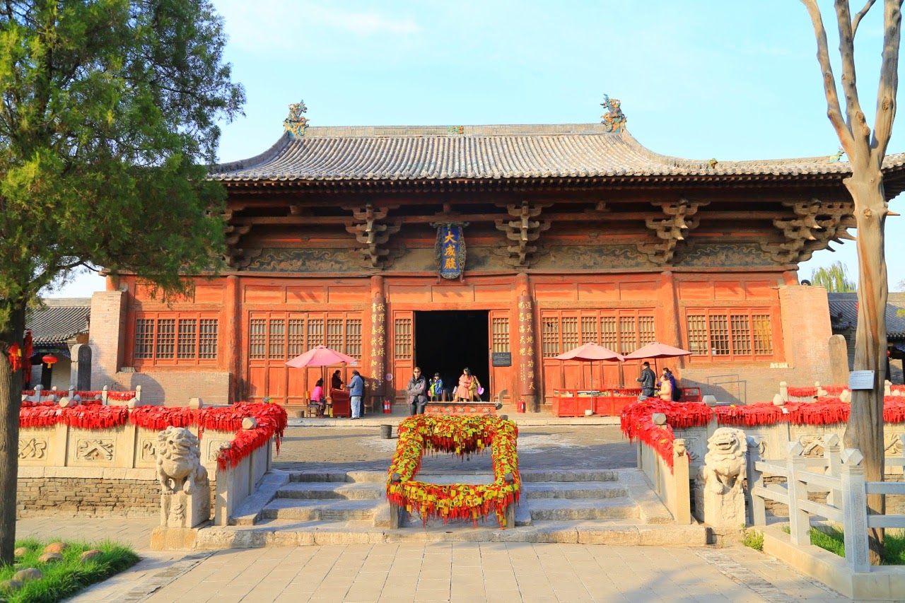Après un petit-déjeuner chinois (thé, salade de choux, œufs durs et madeleines) et une bonne sieste, on s’est lancé à la découverte du patrimoine de Pingyao en arpentant rues et remparts. Ces murs datant du 14èmesiècle, hauts de 10 m et d’une circonférence de 6 km sont parfaits pour avoir une vue d’ensemble de l’ancienne ville magnifiquement conservée. Exceptées les voiturettes électriques qui foncent à toute blinde dans les 2 rues principales, le temps semble s’être arrêté à l’intérieur de l’enceinte fortifiée : des tas de charbon sont adossés sur le devant des maisons, le maïs sèche sur les toits et le linge est suspendu dans la rue ! Dans de petites ruelles pavées circulent péniblement des vélos chargés de gros sacs de denrées et une mule est attachée à un arbre en attendant son prochain chargement. Des guirlandes de petits drapeaux rouges attachées entre les maisons viennent égayer les allées et tranchent avec le gris des briques et des toits.