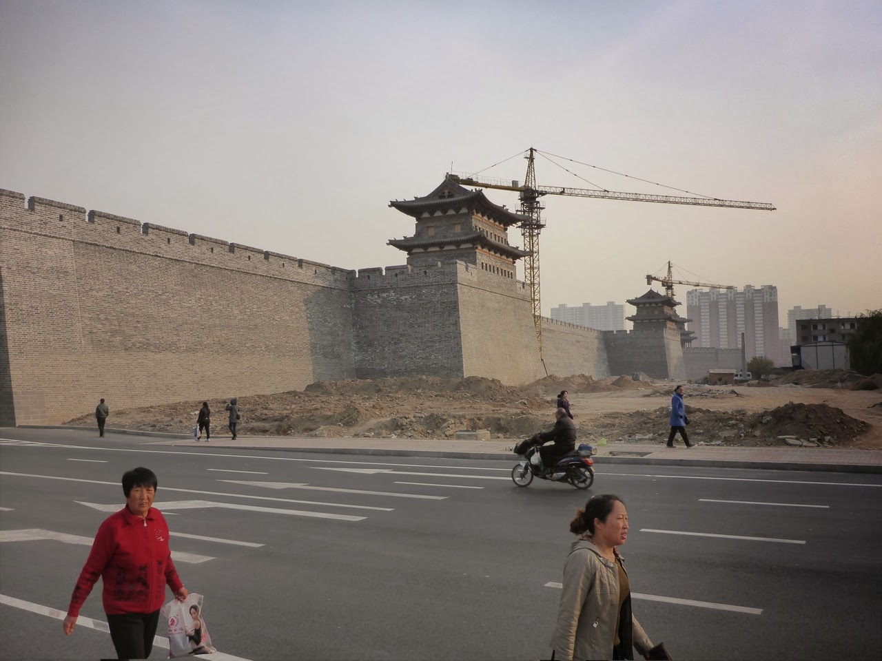 De loin, on distingue les remparts qui nous semblent magnifiquement conservés avec tous les 100 m de belles pagodes en pierre en guise de tour. C’est en nous approchant qu’on peut découvrir la « tromperie », c’était effectivement trop beau pour être authentique… Tout d’un coup la muraille s’arrête et nous contournons les palissades de chantier pour découvrir une section de l’édifice : une structure avec des piliers en béton tout frais, suffisamment large et haute pour y contenir un court de tennis intérieur, habillée de chaque côté par des pierres grises pour achever la copie de vrais remparts datant de la dynastie Qing. Toute la muraille n’est qu’un décor de parc d’attractions sur laquelle on peut faire du vélo et prendre des clichés de la vieille ville, tout aussi reconstruite !!! Ainsi on a pu barrer de notre programme de visite, la marche prévue le lendemain pour admirer les remparts !
