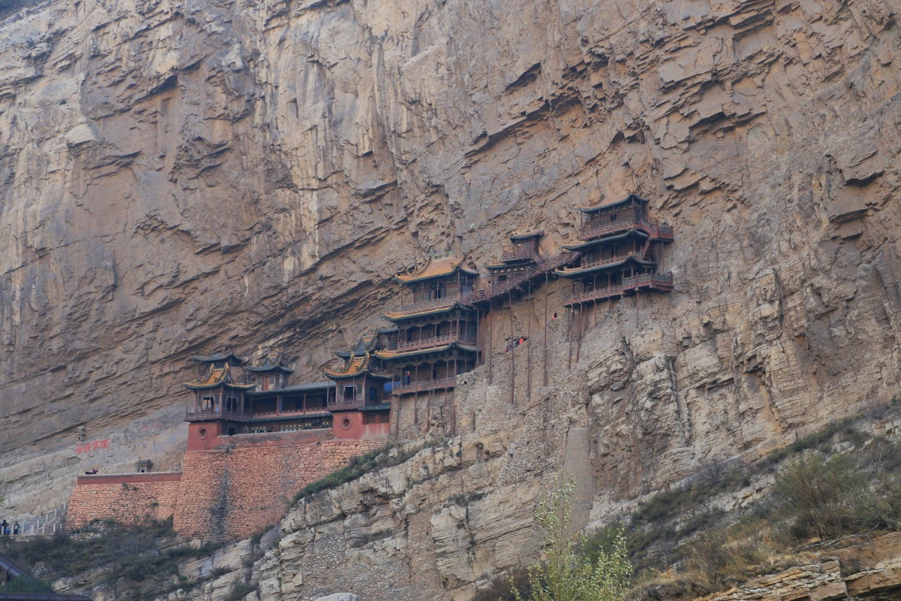 Après le déjeuner, on a repris la route en direction du Monastère suspendu et plus on s’éloignait de Datong vers le sud-est, plus les plaines laissaient la place aux montagnes qui tout d’un coup sortaient de terre comme par magie. Le contraste entre les 2 paysages est saisissant tellement il est soudain. Pendant le trajet, mon grand jeu était de repérer à chaque sommet les remblais cubiques de terre des anciennes tours d’observation “déshabillées“ de leurs briques datant des Ming.