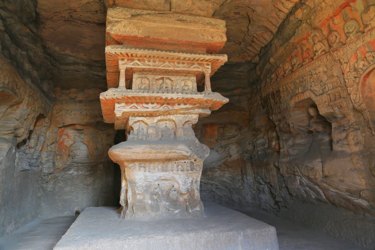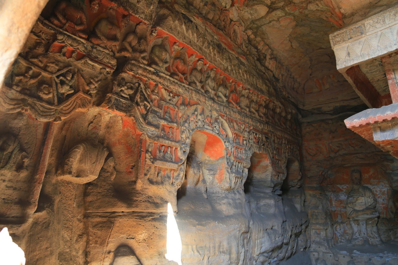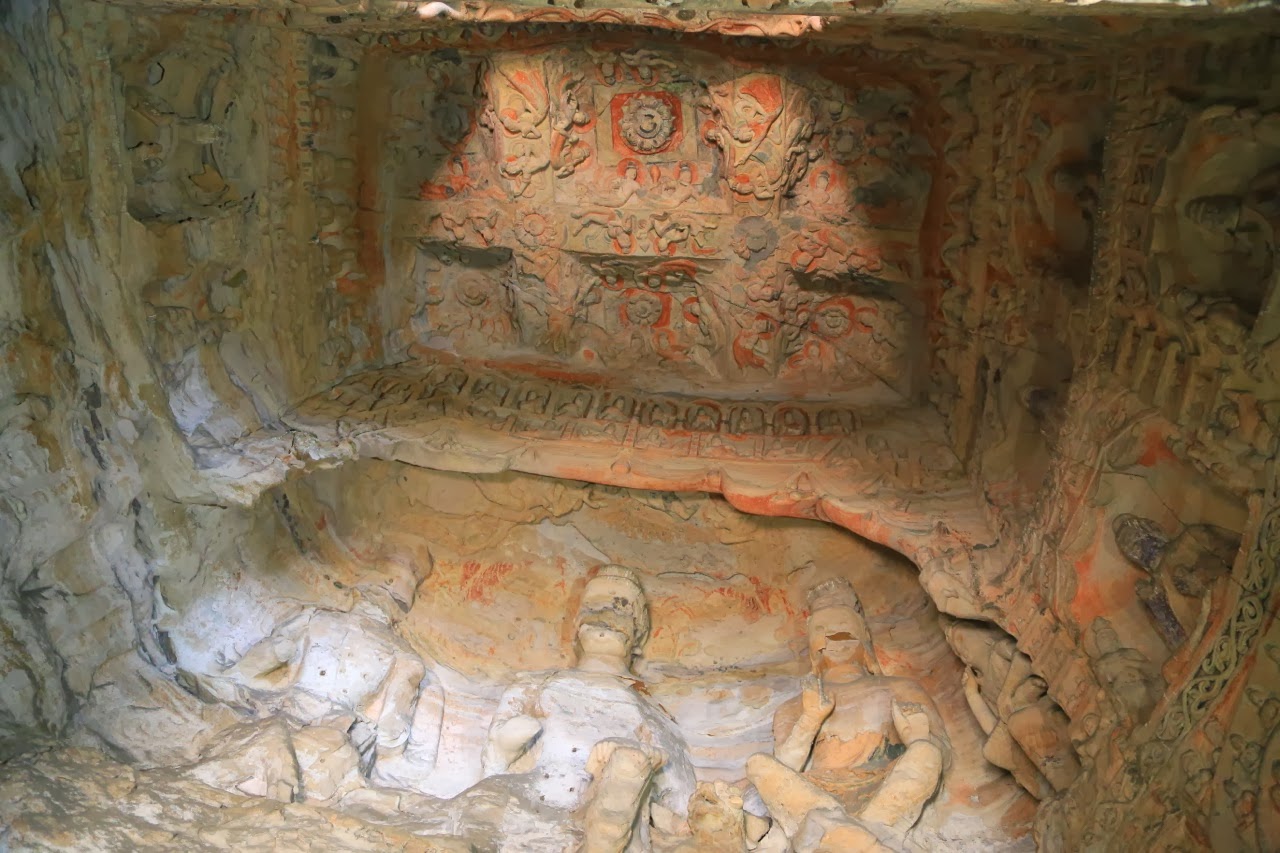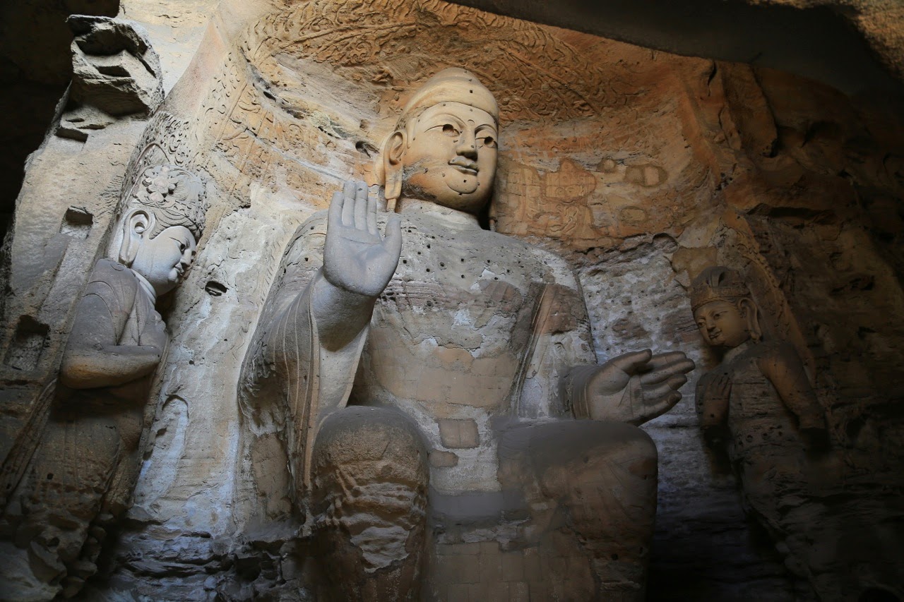 Ces grottes du Ve siècle renferment plus de 50000 statues, certaines sont très abimées par le temps, les pillages et les dégradations effectuées durant les conflits. D’autres sont juste suffisamment restaurées pour rester authentiques. Enfin de la vieille pierre !! A l’abri du vent et du soleil et à l’intérieur de leur grotte, les bouddhas ont gardé leurs magnifiques couleurs. Dans certaines grottes, on découvre de véritables temples taillés dans la pierre en forme de pagodes carrées si bien peintes qu’on dirait du bois !! Chaque cavité est différente et on en prend plein les yeux, notre guide va d’ailleurs trop vite. On ne sait où regarder tellement les détails sont nombreux que ce soit sur la statue centrale, sur les autres disposées à côté, sur les murs ou au plafond et sur tous les autres éléments de décoration. Il a fallu 60 ans pour sculpter ces cavernes et on comprend aisément pourquoi…