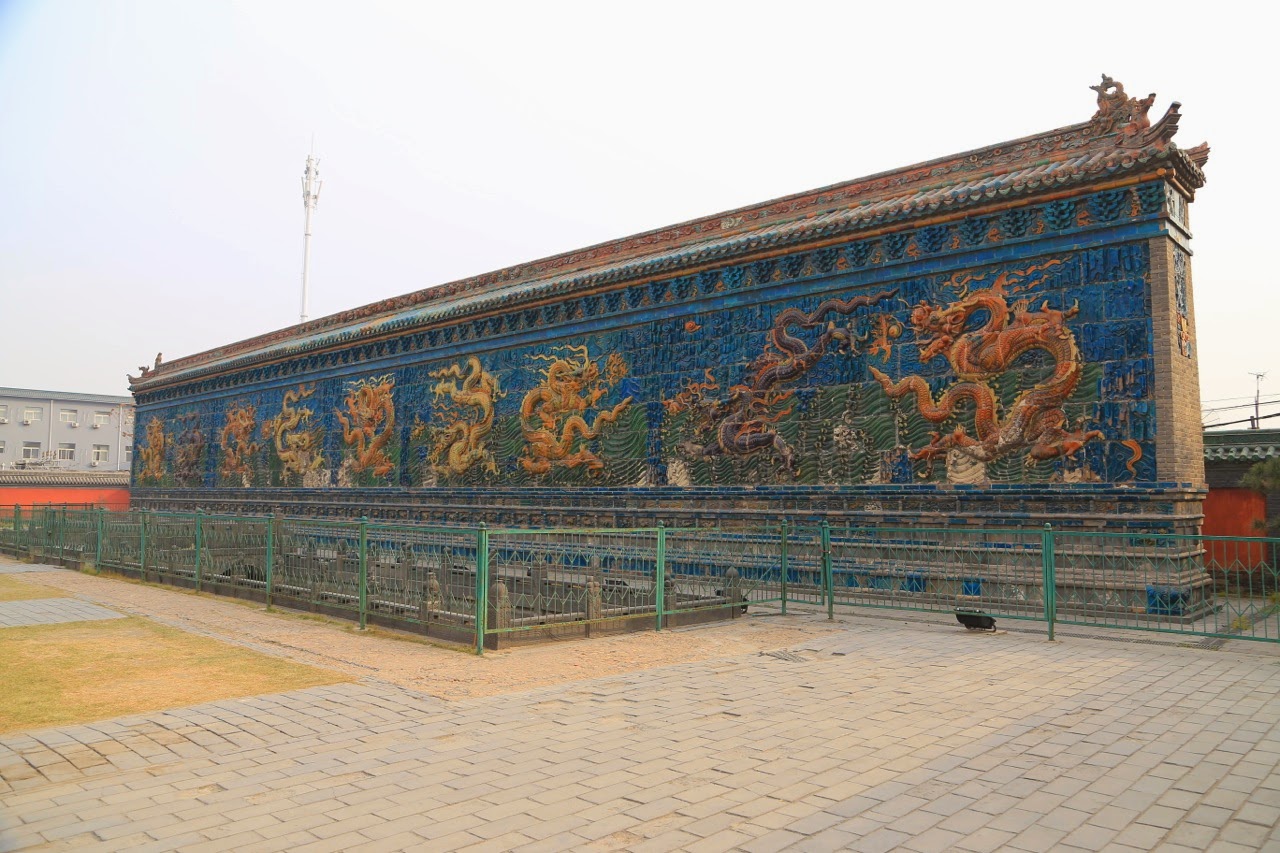 Un peu plus loin, on s’est mis en quête de trouver (difficilement) le mur des Neufs Dragons qui a la particularité d’être le plus grand mur en faïence de Chine : 45 m de long, 8 m de haut et 2 m de large. J’avoue que je l’imaginai plus grand, du moins un peu plus pour être vu de la rue car heureusement que des cars de touristes se sont soudainement arrêtés devant une cour, sinon je pense qu’on aurait pu passer devant l’entrée sans l’apercevoir !!