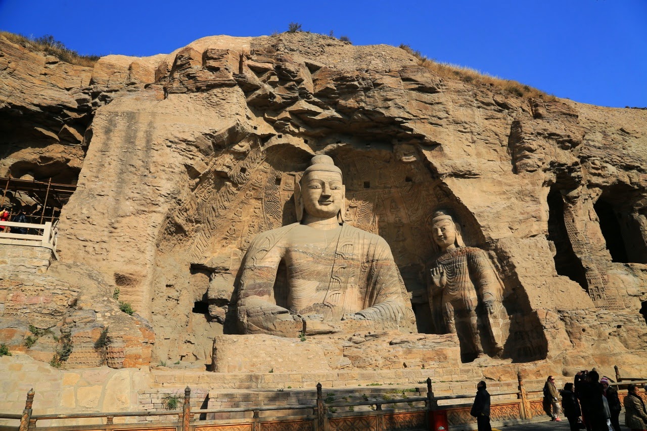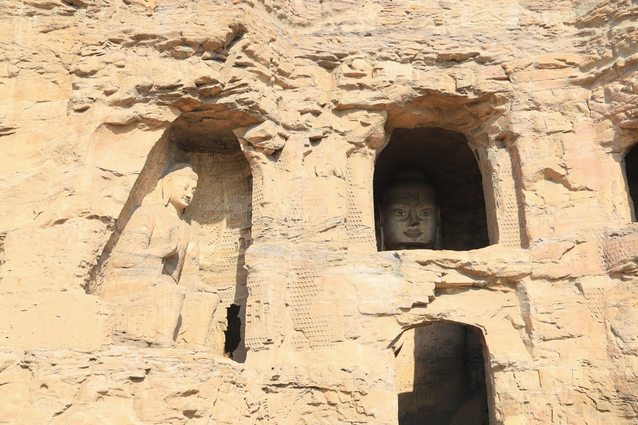 Au total, le site compte 252 grottes mais seulement une vingtaine est vraiment spectaculaire. Sachant que certaines, assez importantes, étaient en cours de travaux au moment de notre visite. L’apothéose arrive avec la cavité n°20 qui représentait les 3 bouddhas du passé, du présent et du futur. J’écris “représentait“ car le temps a eu raison du bouddha du passé qui a presque totalement disparu ; comme quoi le temps fait oublier le passé… Le bouddha central, celui du présent, est immense et réellement impressionnant. Tout comme la Grande Muraille ou la Cité Interdite, il constitue le passage obligé pour la photo souvenir ! A la fin de la matinée, on a refait le chemin dans le sens inverse pour regagner la sortie et je n’ai pu m’empêcher de refaire une série de clichés tellement il y avait matière à mitrailler ces envoûtantes sculptures.
