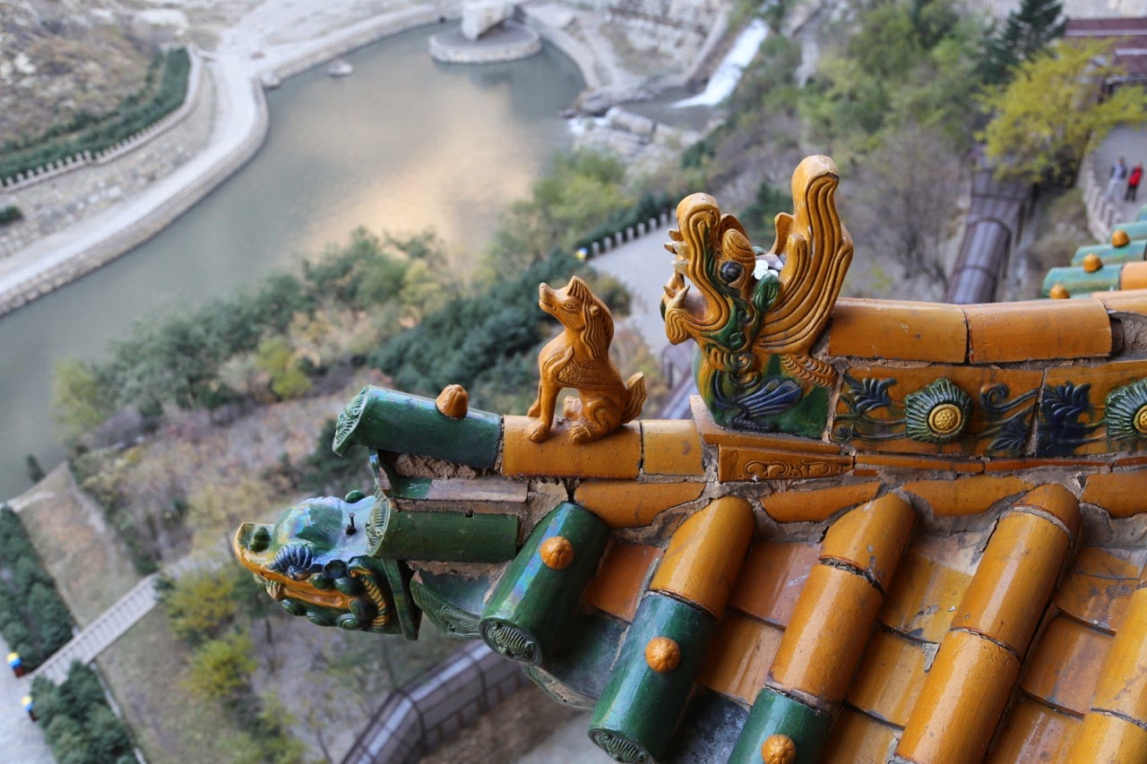 Après avoir frôlé la mort à chaque virage lorsque notre intrépide chauffeur doublait les camions surchargés qui semblaient à l’arrêt dans les montées, nous sommes finalement arrivés sains et saufs à destination ! Le premier réflexe en descendant du minivan est de regarder en l’air, le long des parois des gorges du Jinlong pour repérer le fameux monastère. Le voilà, avec ses pagodes accrochées à la falaise au-dessus de la rivière et soutenues par de frêles étais de bois qui, du parking, semblent aussi fines que des allumettes ! Mais quel est l’homme assez fou pour construire un tel édifice là-haut ?? La hauteur semble assez haute, accentuée par un barrage en amont qui retient la rivière. De modernes escaliers nous amènent jusqu’au premier des trois ensembles de bâtiments et on retrouve un vrai temple aux pièces étroites et sombres avec des bouddhas très poussiéreux. Chaque pagode est reliée à la suivante par des passerelles soit creusées dans la roche, soit en bois. Sur l’une d’entre elle, on passe entre les piliers qui soutiennent la passerelle du dessus et on peut secouer les montants en bois avec une telle amplitude qu’on se demande comment cela peut soutenir quelques chose !!!
