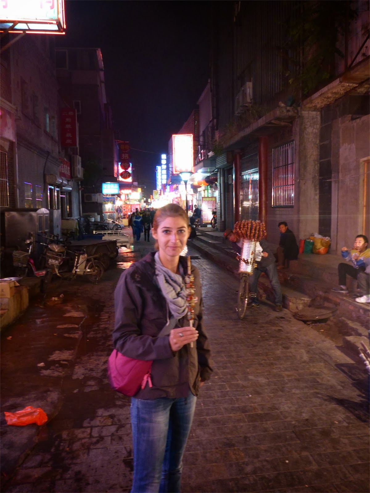 Le premier soir, nous avons découvert la bouffe de rue et dès 17h les Chinois se pressent pour acheter brochettes de porc et autres beignets à la vapeur à des commerçants ambulants. Les Chinois mangent tôt et surtout on a l’impression qu’ils mangent tout le temps. Ainsi on peut arpenter des « food market » avec des ruelles piétonnes avec uniquement des marchands de bouffes sur des centaines de mètres !! C’est dans l’une d’elle qu’Adèle et moi avons gouté notre première brochette…………. de scorpions frits !! Avec un peu de paprika, c’est goûteux même si Adèle a été prise d’une crise de démangeaisons quelques heures plus tard !