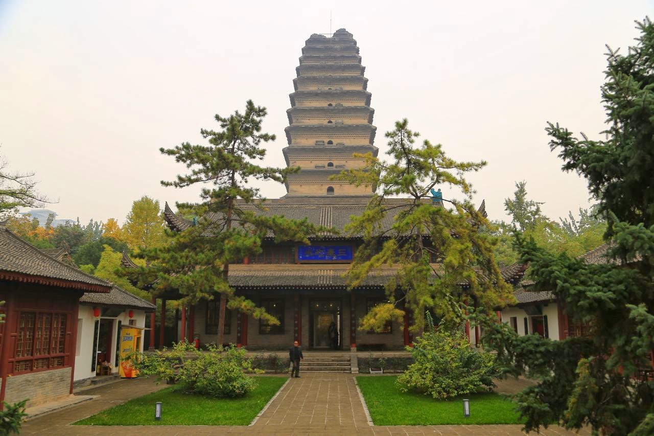 Petite pagode de l’oie sauvage qui est située au sud des remparts dans un très joli parc dans lequel on pouvait apercevoir………… des oies (c’était facile !!). Cette pagode construite entre 707 et 709 faisait à l’origine 45 m jusqu’à ce qu’un tremblement de terre la raccourcisse de 2 m en 1556. On a grimpé les 15 étages mais les escaliers ne sont pas prévus pour un grand dadet d’1m90 et après un bel échauffement des jambes lors de la montée, exercice de souplesse pour les 3 derniers étages ! D’en haut la vue n’est pas géniale, la brume de Xi’an venant voiler l’horizon.