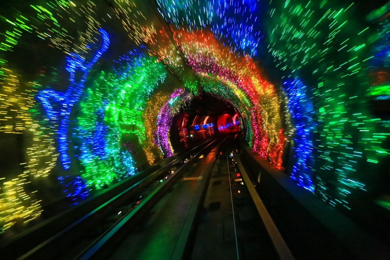 A mi-chemin, on a customisé le parcours en traversant le fleuve pour voir les gratte-ciels de Pudonggrâce au “Bund Sightseeing Tunnel“, une sorte d’autorail souterrain qui vous fait passer de l’autre côté de la rive avec des musiques et des éclairages totalement psychédéliques ! Une fois arrivés dans le nouveau quartier des affaires, nous avons pu profiter d’une vue plus dégagée sur le Bund et nous nous sentions tout petits au pied de ces incroyables gratte-ciels : World Financial Center (le décapsuleur), Jinmao Tower, Oriental Pearl Tower.