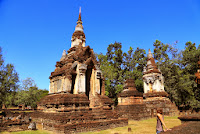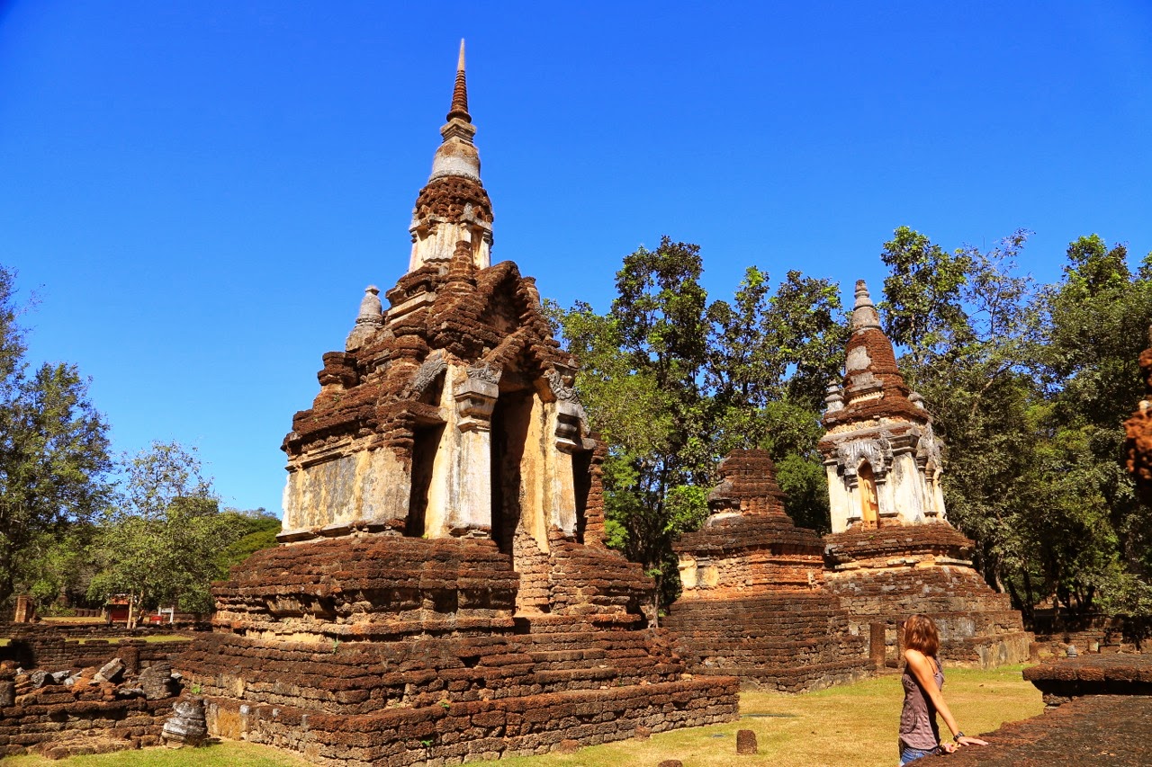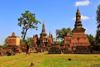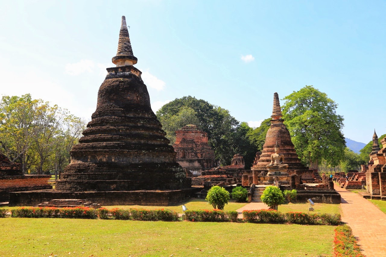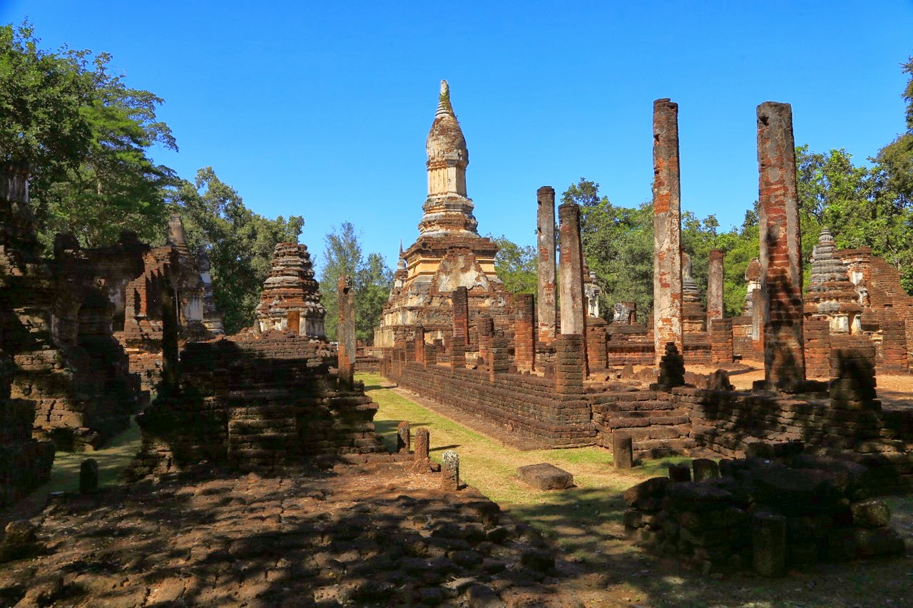 Wat Mahathat donne le ton, c’est le temple central et le plus important du parc entouré d’une enceinte carrée en brique de 200 m de côté. Il dispose d’un chedi principal en forme de bouton de lotus, caractéristique du style de Sukhothai, dont la base est décorée de disciples en stuc, marchant dans le sens des aiguilles d’une montre comme le veut le culte. En tout, le monastère compte près de 200 chedis et on peut admirer quelques majestueux bouddhas d’origine dont l’un (debout) qui toise à 12 m de hauteur.