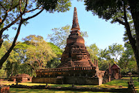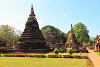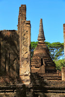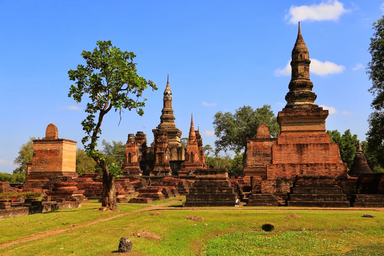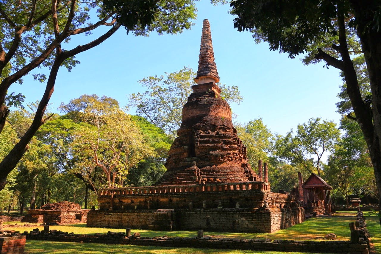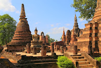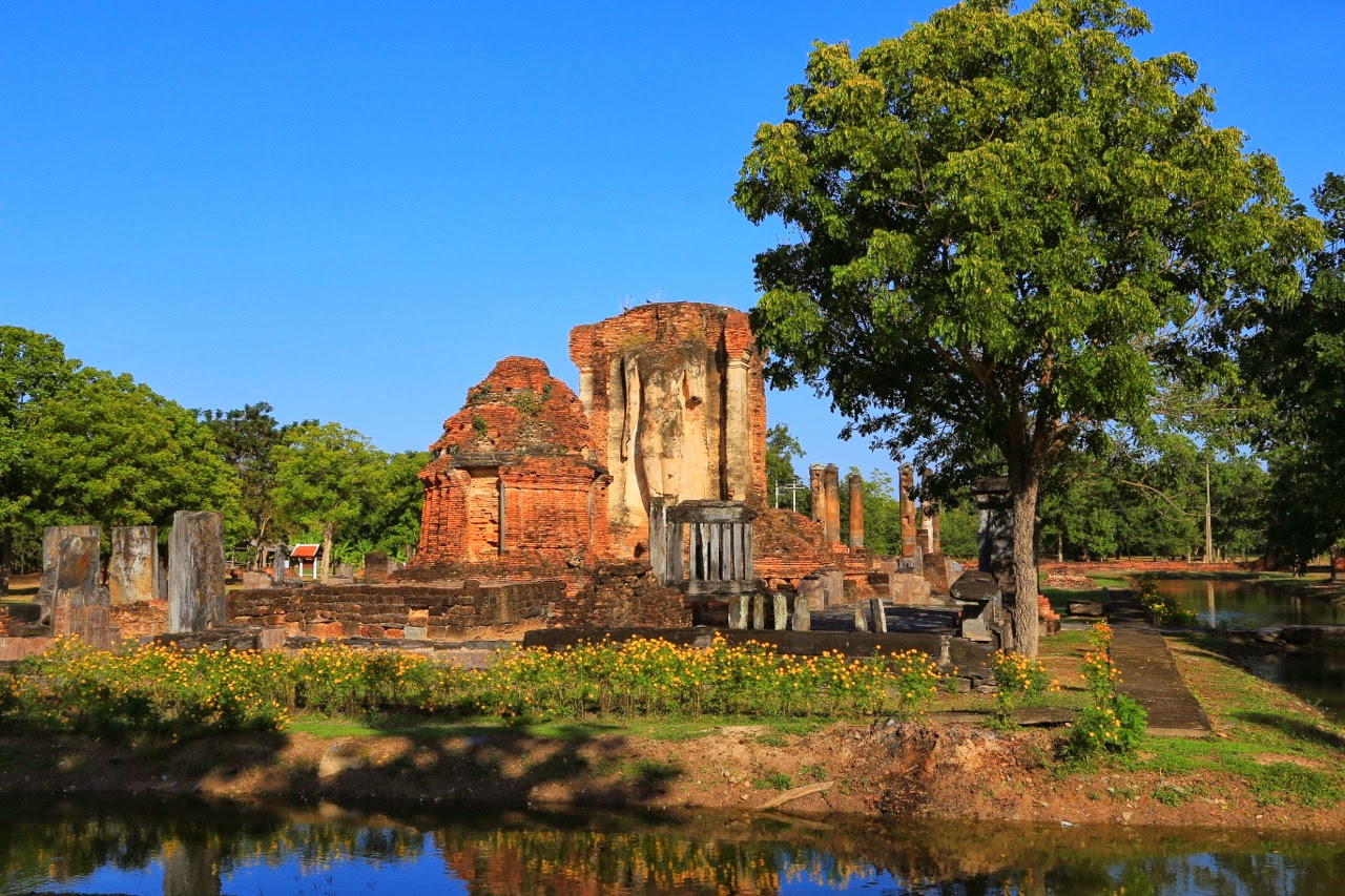 Wat Mahathat donne le ton, c’est le temple central et le plus important du parc entouré d’une enceinte carrée en brique de 200 m de côté. Il dispose d’un chedi principal en forme de bouton de lotus, caractéristique du style de Sukhothai, dont la base est décorée de disciples en stuc, marchant dans le sens des aiguilles d’une montre comme le veut le culte. En tout, le monastère compte près de 200 chedis et on peut admirer quelques majestueux bouddhas d’origine dont l’un (debout) qui toise à 12 m de hauteur.