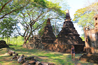 Le parc de Sukhothai est énorme et très riche : pas moins de 70 sites dans un rayon de 5 km dont 21 à l’intérieur de l’enceinte. On ne les a pas tous visité et je vous rassure, je ne vais même pas (trop) vous narrer l’histoire de ceux qu’on a vus ! D’une part, il y a Wikipedia pour ça et d’autre part pour les décrire, je serai à court de synonymes de magnifique, splendide, majestueux, etc. !!! Donc en résumé notre conseil si vous allez en Thaïlande, VENEZ VOIR SUKHOTHAI !! On n’aurait jamais imaginé voir autant de ruines, certes pas toujours bien conservées mais le spectacle est réellement merveilleux et il se dégage de ses pierres, une atmosphère difficile à transcrire………… entre recueillement, émerveillement et fascination. De plus, les sites étaient relativement peu fréquentés et permettent de prendre son temps et de faire tranquillement des photos sans un car de Chinois sur les clichés ! Adèle s’est également laissée ensorceler par les lieux et a attrapé le même virus que moi, en shootant avec son compact les monuments sous tous les angles ! Il y avait des touristes venus de tous les horizons mais aussi des locaux qui venaient en famille, pique-niquer aux abords des temples !
