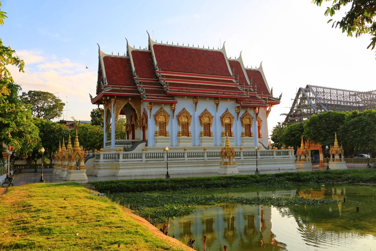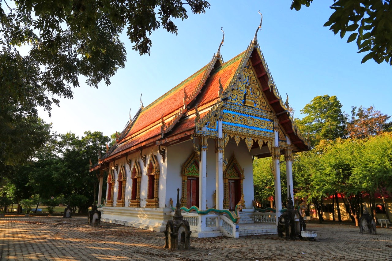 De l’autre côté de la route, presque entièrement caché par la forêt, on distingue le chedi à 20 côtés du Wat Lak Muang dont la construction est largement influencée par le style khmer. Lak Muang signifie la poste de la ville et confère à ce temple une fonction tout à fait originale !