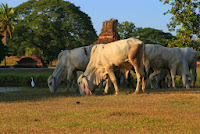 Sur la route du retour à l’hôtel, le Wat Sorasak a retenu notre attention : la base de son chedi était décorée d’éléphants dont l’état de conservation (ou de rénovation ?) nous a surpris. A coté du temple, de maigres vaches broutaient l’herbe sous le regard amusé des enfants.
