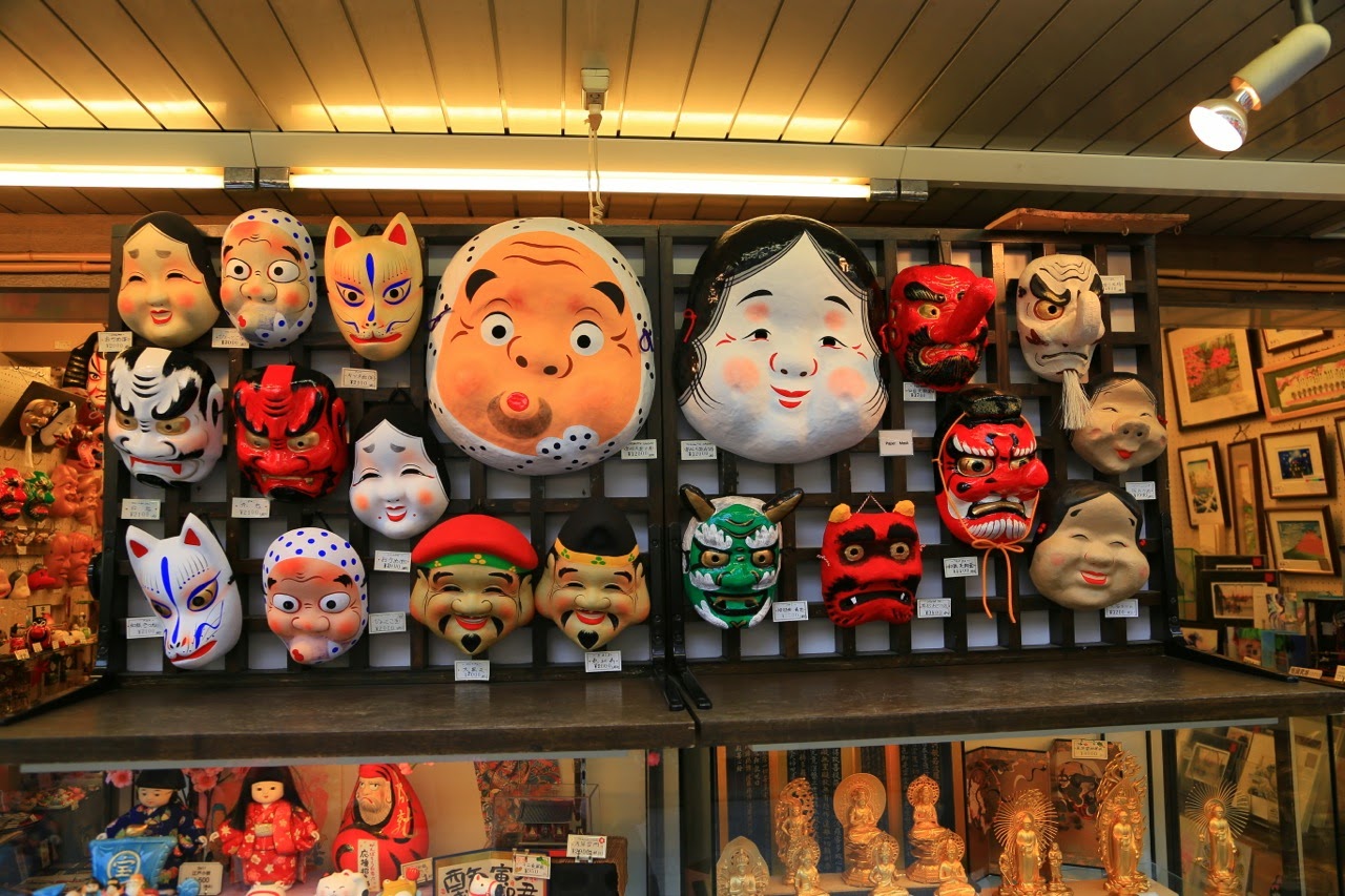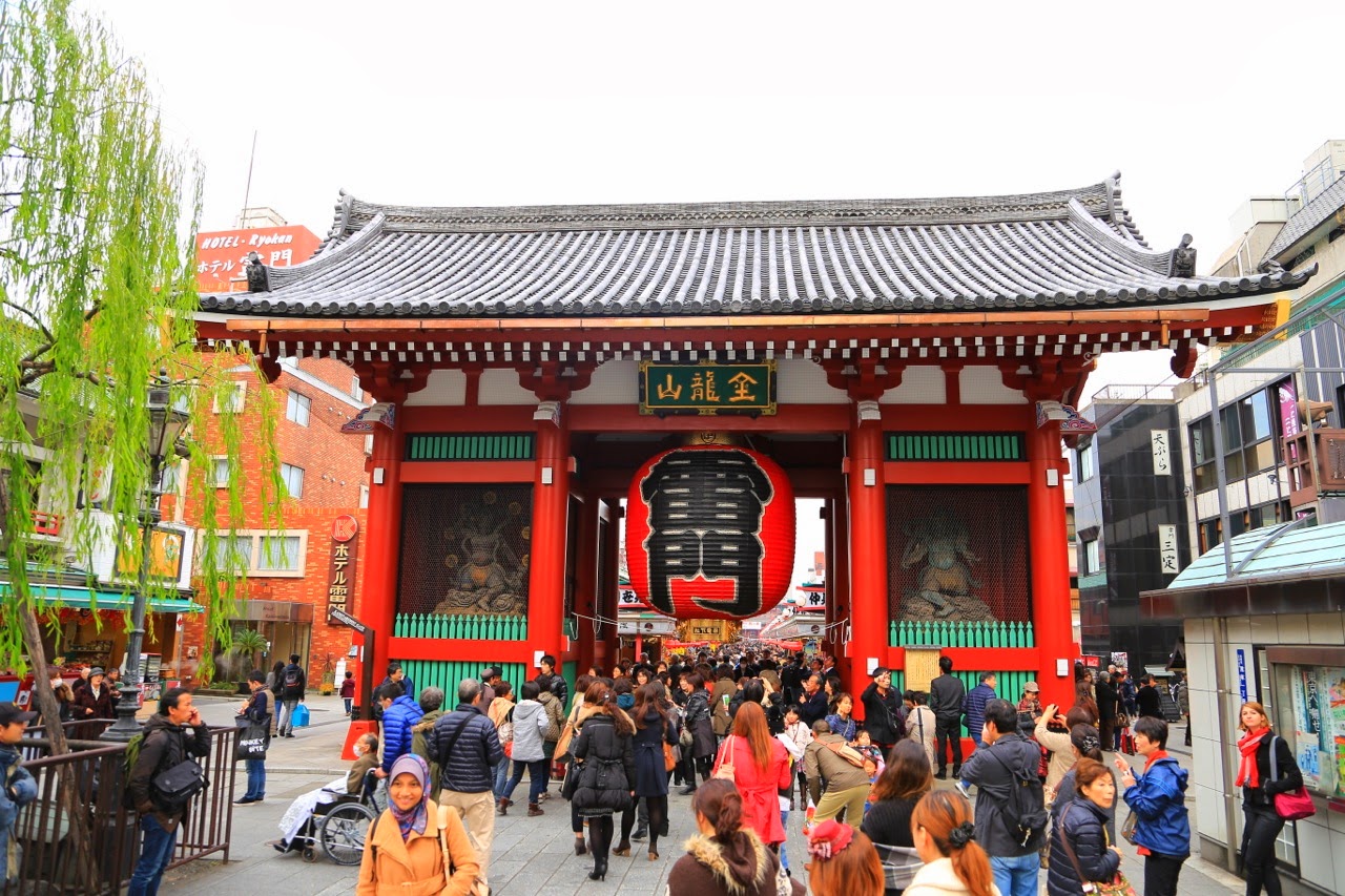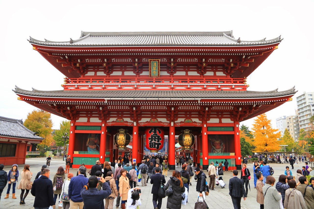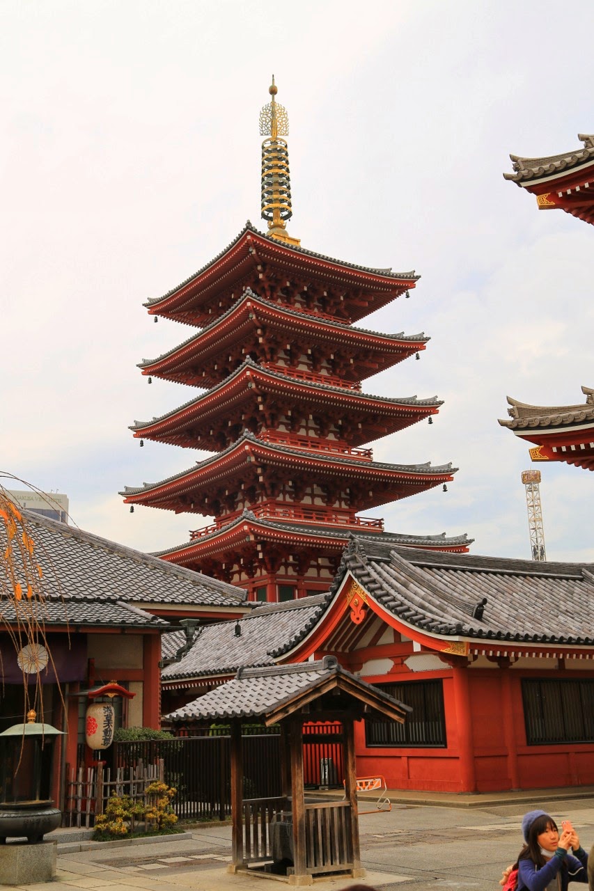 Pour notre dernière journée à Tokyo, nous nous sommes rendus dans le quartier d’Asakusa où se situe le temple Senso-ji qui renferme une statue en or de Kannon, la déesse bouddhique de la compassion. Passage obligé pour arriver jusqu’au temple : la galerie marchande de Kamamise-doricomposée d’une centaine de boutiques commercialisant bouffe mais aussi éventails, kimonos, sabres et tout un catalogue de souvenirs japonais (ou chinois !!!). Il y règne une certaine effervescence et c’est bien la première fois que nous prenions plaisir à flâner dans les magasins pour touristes !
