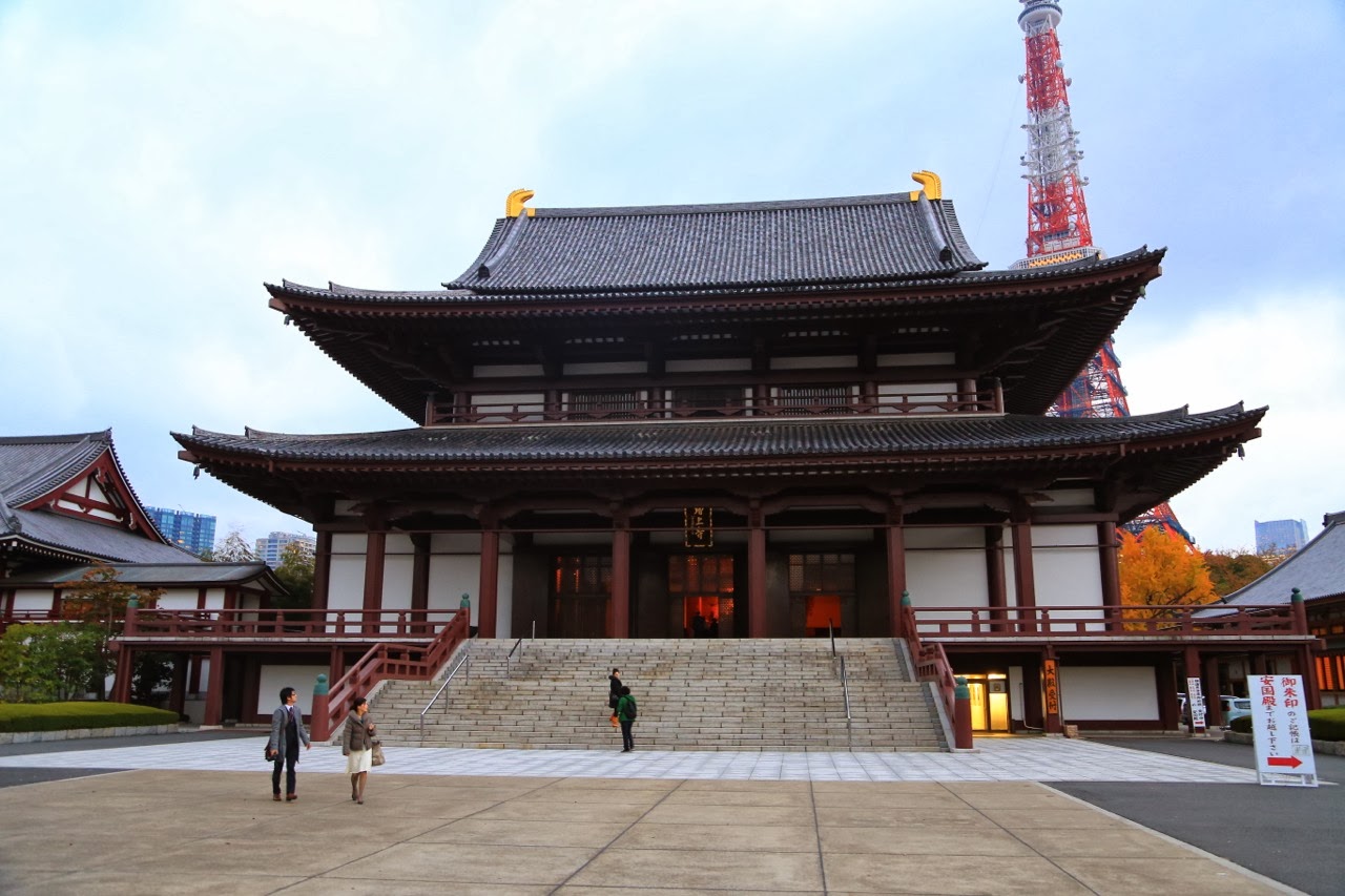 En marchant une borne plus à l’ouest, on a traversé le sanctuaire du temple Zojo-ji qui se situe juste devant la Tokyo Tower, une des plus hautes tours en métal du monde, battant notre Tour Eiffel nationale de seulement 7,6 m ! Pour nous y rendre, on a d’abord traversé le cimetière du temple dont les haka(tombes) en pierre regroupent les cendres des familles avec le nom des membres figurant sur des planches en bois. Le Japon est le pays où les obsèques sont les plus chères au monde en raison du manque de place dans les cimetières !!