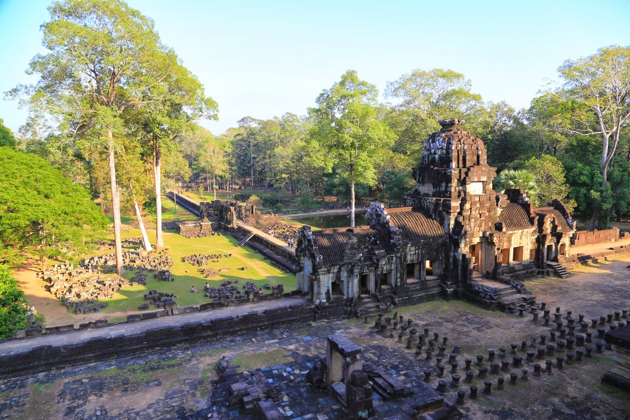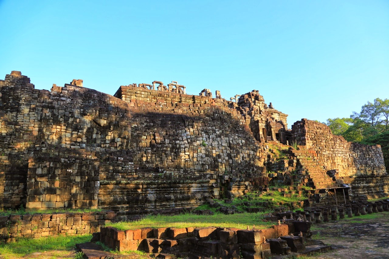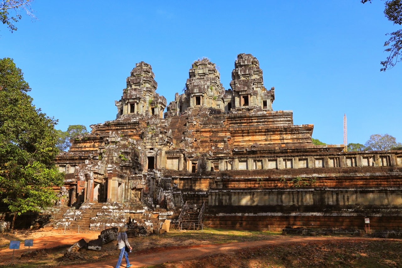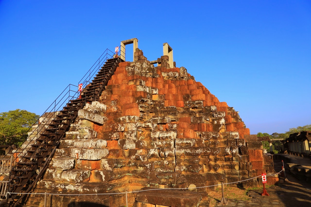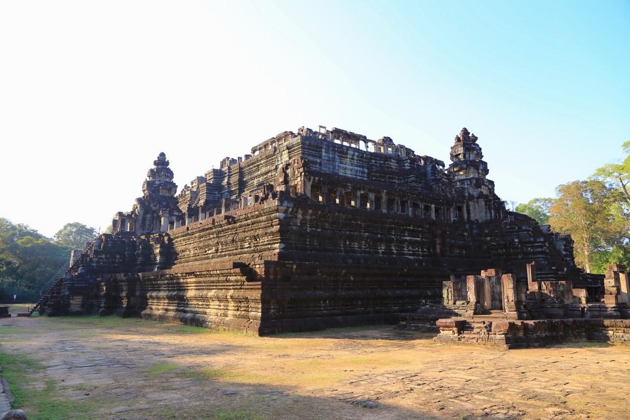 Petit conseil pour prendre de belles photos, venez tôt le matin (et non en fin de journée comme nous) sinon vous allez vous battre avec les contre-jours et les ombres des arbres. Le parc d’Angkor est ouvert de 5h à 17h et d’une façon générale vaut mieux se lever tôt car malgré leur grandeur, les temples sont tellement noyés dans la végétation que celle-ci a vite fait de vous “noircir“ les clichés dès le début de l’après-midi… Baphuon est également impressionnant avec sa structure pyramidale représentant le mythique Mont Meru dont la construction marquait le centre de la cité avant la construction d’Angkor Thom. Avant que la guerre civile n’éclate, Baphuon concentrait tous les efforts d’une rénovation minutieuse qui ont été anéantis par les Khmers rouges, saccageant le temple et le laissant à l’abandon pendant 25 ans… Un nouveau programme de rénovation commença en 1995 et nécessita 10 ans pour arriver à restituer la grandeur d’antan que l’on peut voir sur les photos.