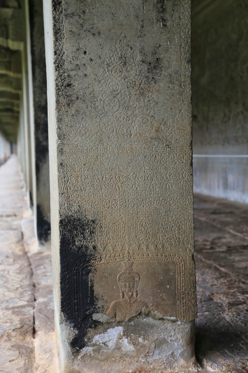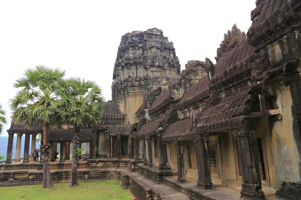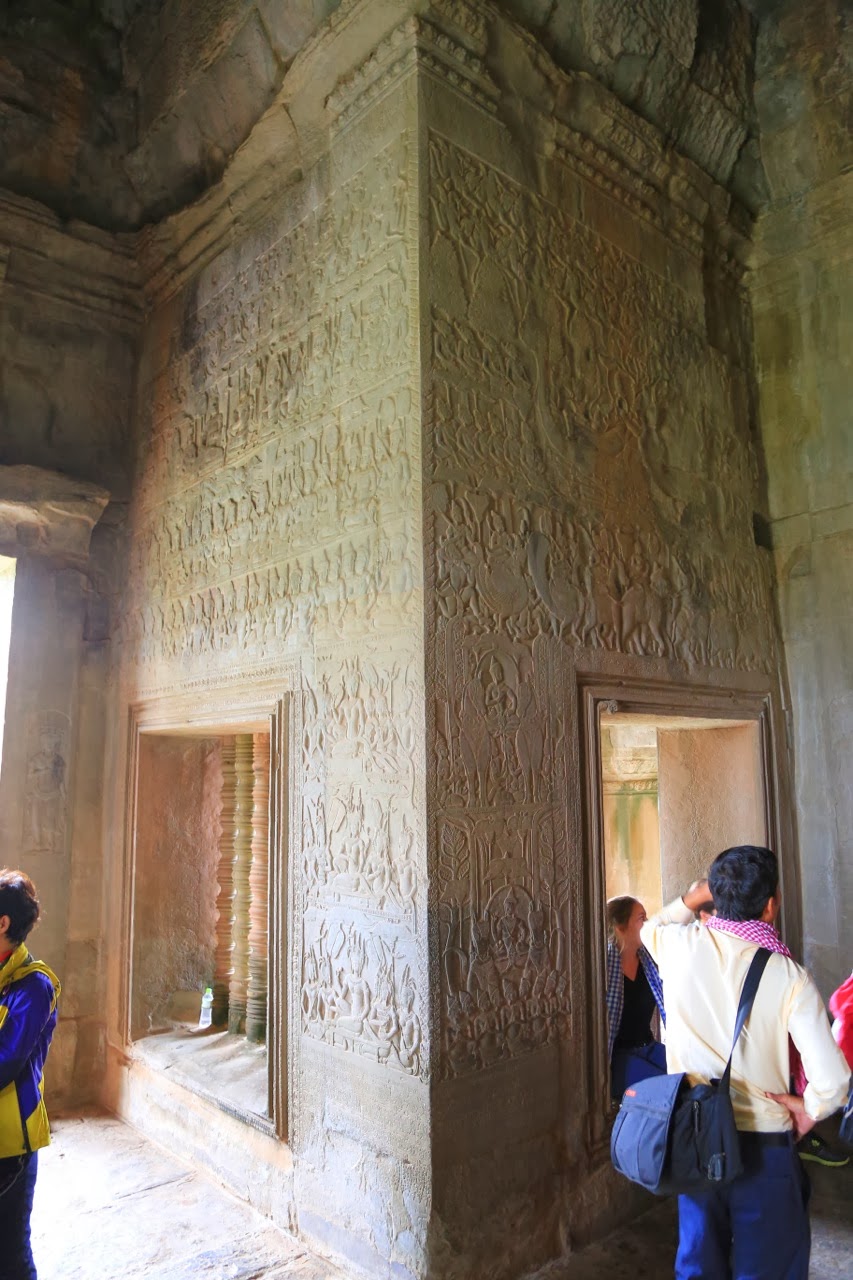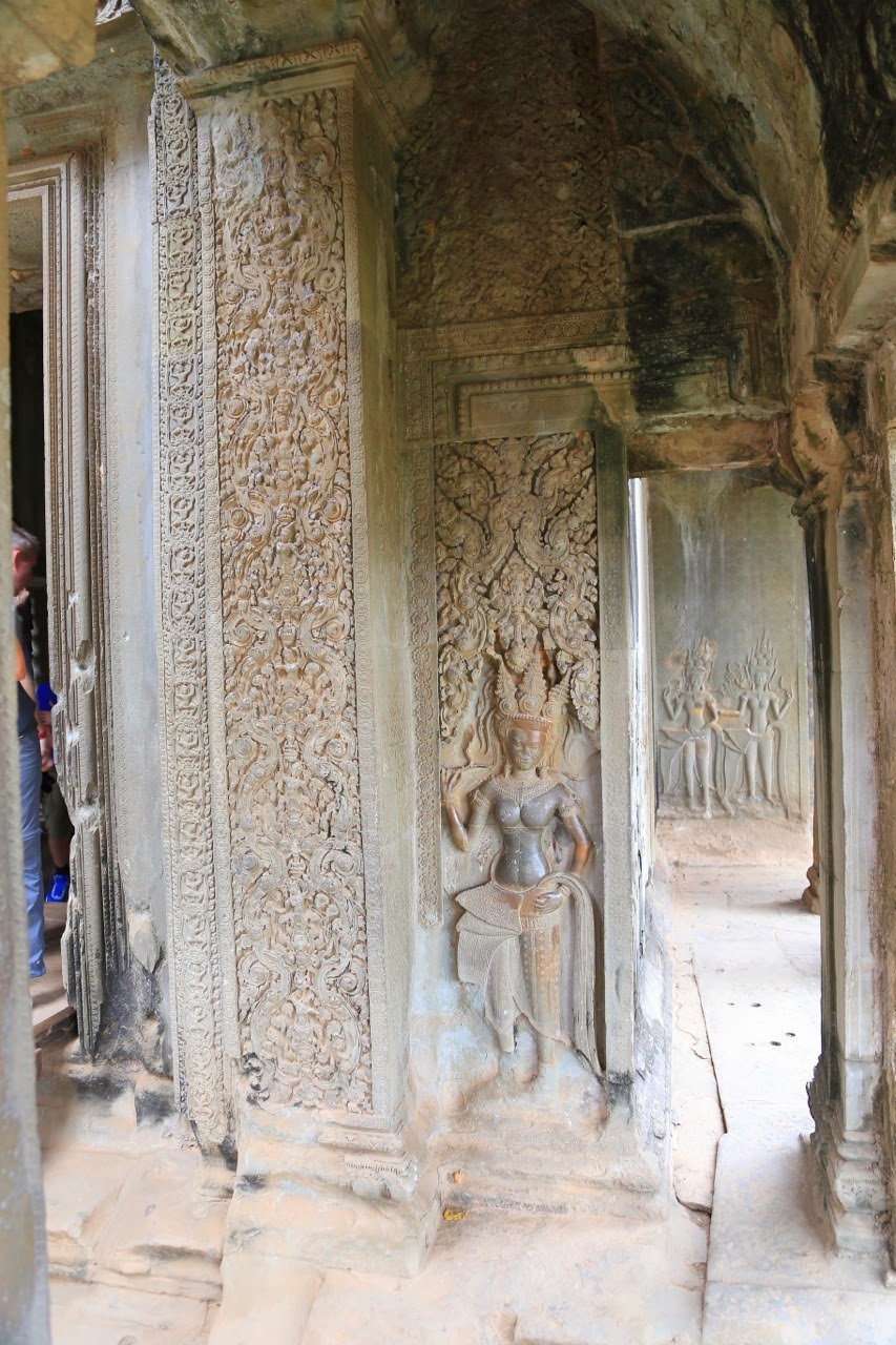 Après nous être acquittés du forfait 3 jours (40 $ par pax, sinon 20 $ pour 1 jour) nous avons emprunté la “petite“ boucle (environ 17 km) qui débute par l’inévitable Angkor Wat ! Sing nous dépose au pied d’un pont en brique qu’il faut traverser pour atteindre la porte principale dont il ne reste plus grand chose des 3 tours. On n’est pas seul et je sens déjà que ça va être “sportif“ de prendre des photos; de toute façon vu le gris du ciel, ce n’est pas aujourd’hui que je vais remporter un concours photo ! Mais dés le pont franchi, on est déjà sous le charme des lieux et on s’attarde à arpenter la galerie de la très large porte ouest (235 m) dont les murs sont recouverts de magnifiques bas-reliefs, et sur les colonnes on distingue quelques-unes des 3000 apsaras (nymphes du paradis). Le tout est très abîmé mais avec un soupçon d’imagination, on peut deviner la beauté des sculptures à l’origine : chaque porte, chaque encadrement de fenêtre, chaque cm2 de pierre est travaillé et façonné avec une précision hallucinante. Je n’ai jamais été aussi impressionné alors qu’on n’a même pas encore franchi la porte de l’enceinte !!