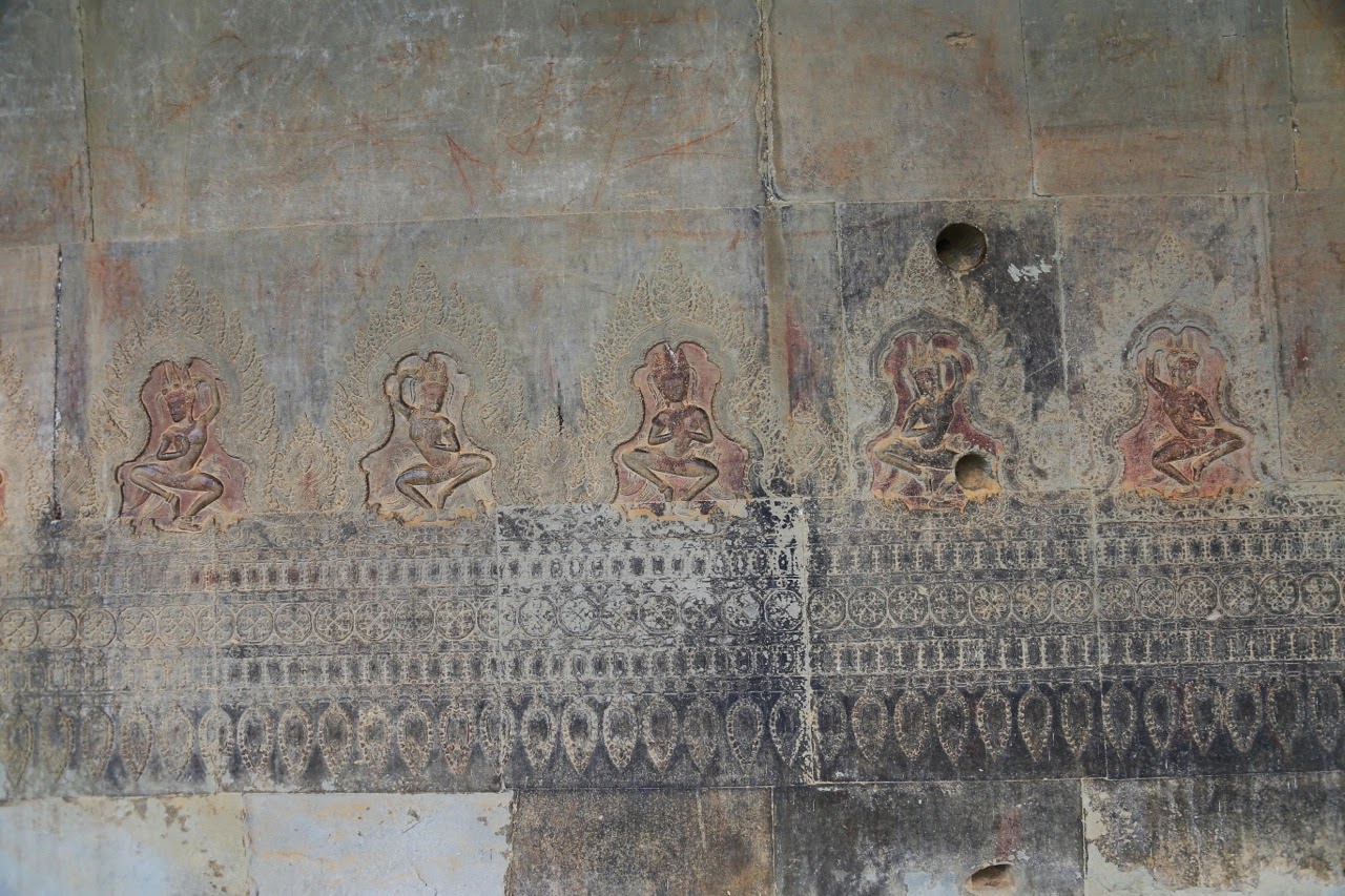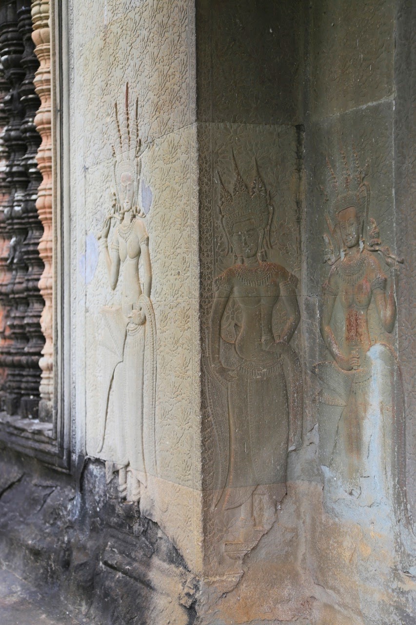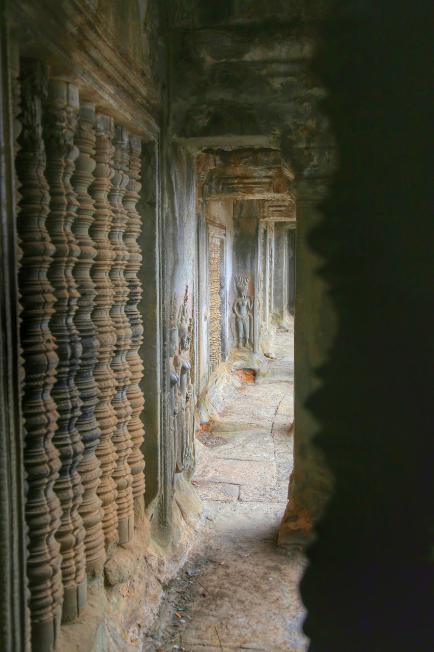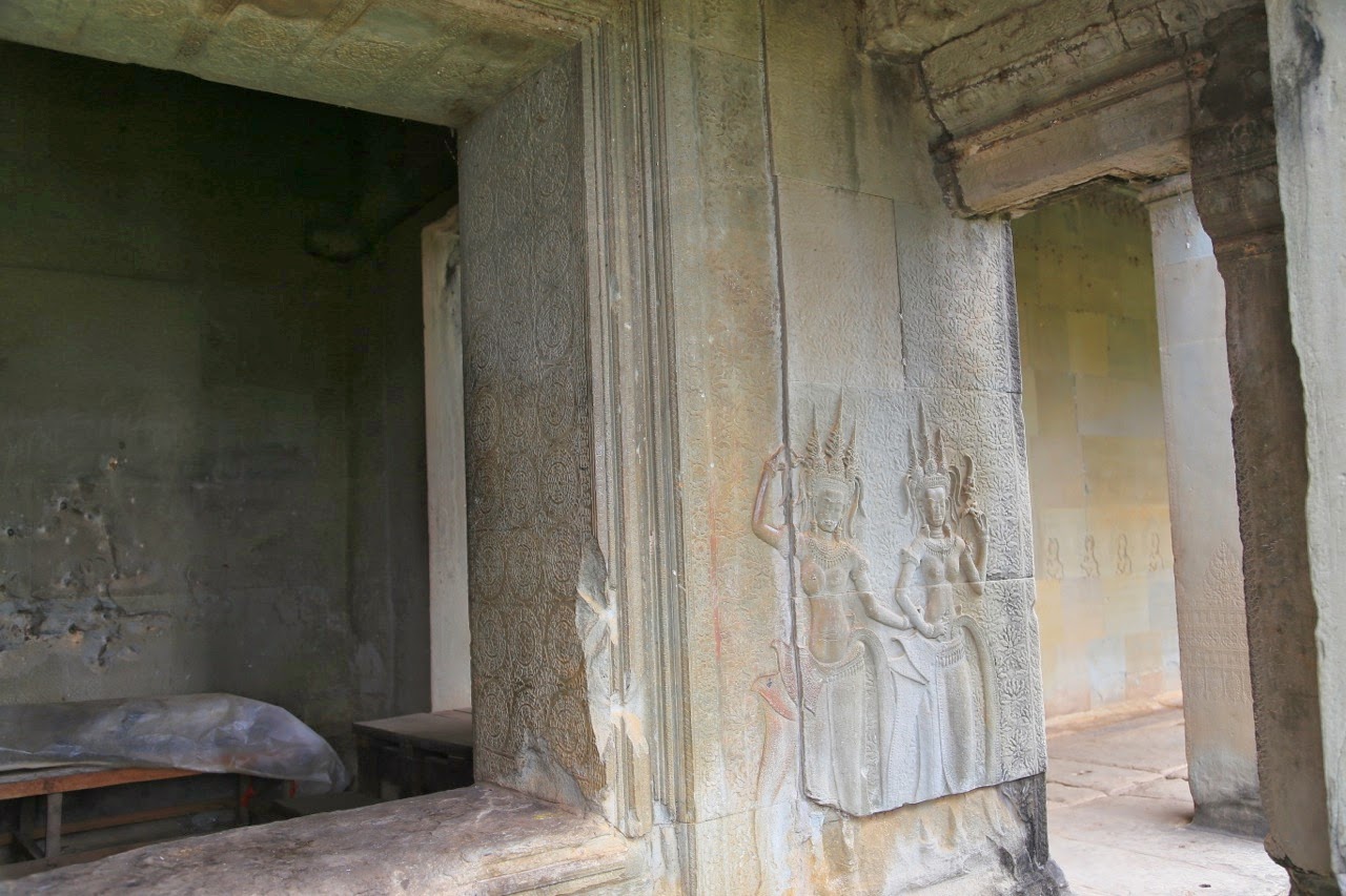 Après nous être acquittés du forfait 3 jours (40 $ par pax, sinon 20 $ pour 1 jour) nous avons emprunté la “petite“ boucle (environ 17 km) qui débute par l’inévitable Angkor Wat ! Sing nous dépose au pied d’un pont en brique qu’il faut traverser pour atteindre la porte principale dont il ne reste plus grand chose des 3 tours. On n’est pas seul et je sens déjà que ça va être “sportif“ de prendre des photos; de toute façon vu le gris du ciel, ce n’est pas aujourd’hui que je vais remporter un concours photo ! Mais dés le pont franchi, on est déjà sous le charme des lieux et on s’attarde à arpenter la galerie de la très large porte ouest (235 m) dont les murs sont recouverts de magnifiques bas-reliefs, et sur les colonnes on distingue quelques-unes des 3000 apsaras (nymphes du paradis). Le tout est très abîmé mais avec un soupçon d’imagination, on peut deviner la beauté des sculptures à l’origine : chaque porte, chaque encadrement de fenêtre, chaque cm2 de pierre est travaillé et façonné avec une précision hallucinante. Je n’ai jamais été aussi impressionné alors qu’on n’a même pas encore franchi la porte de l’enceinte !!