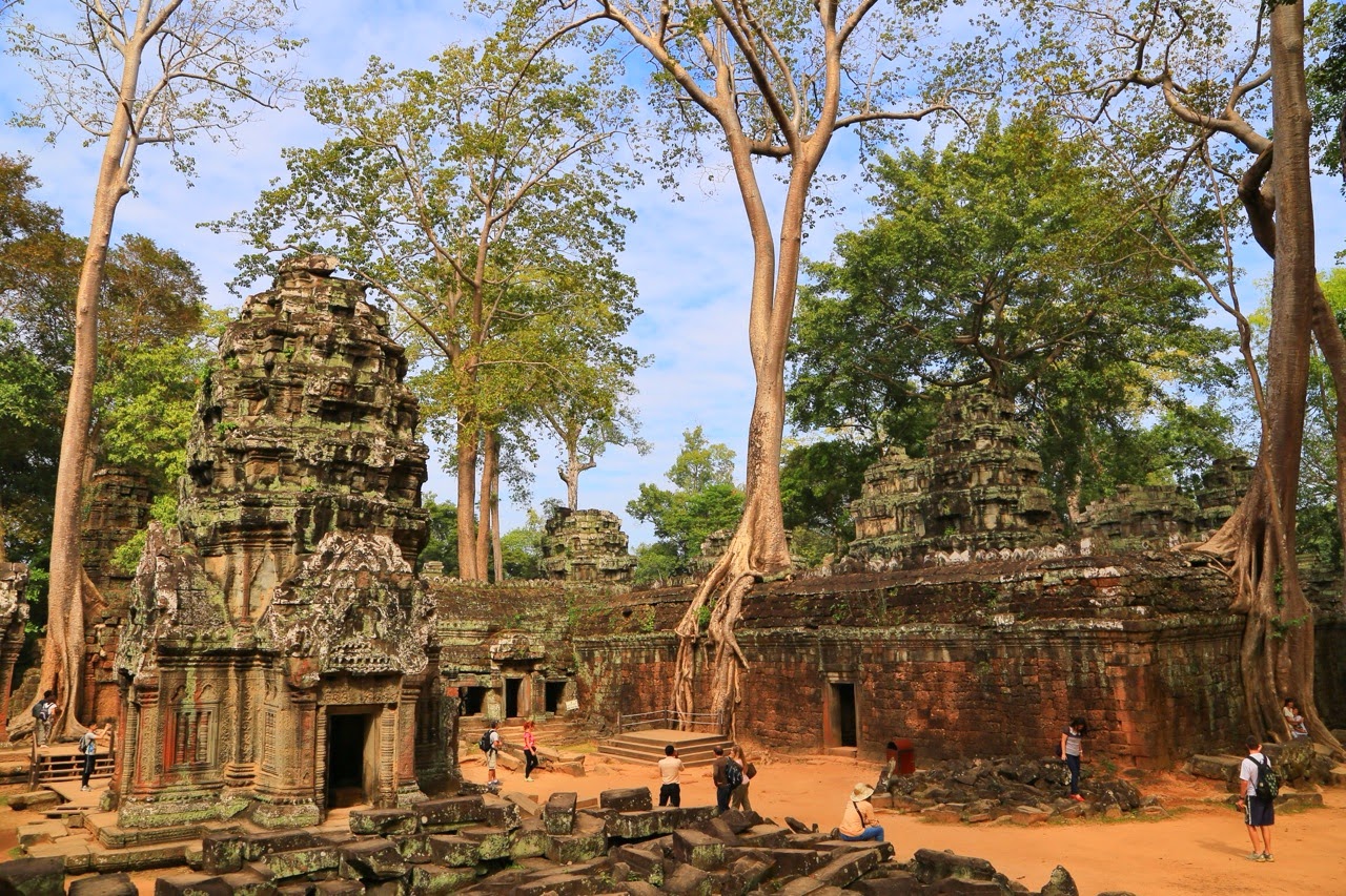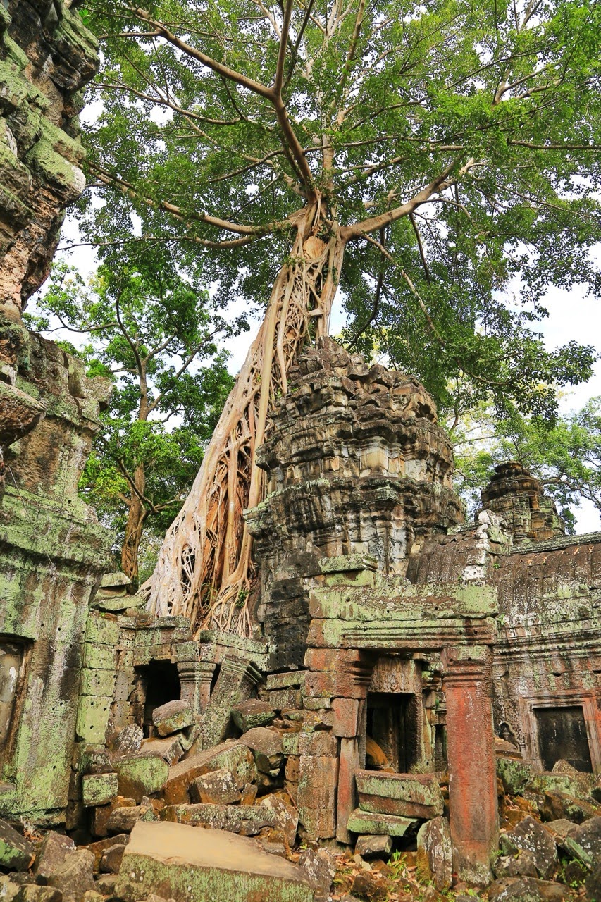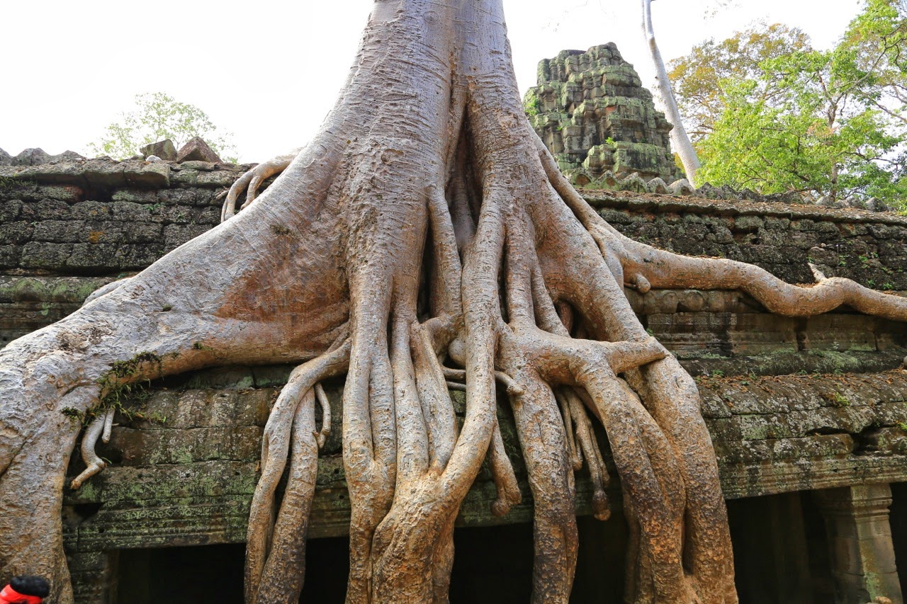 On accède ensuite à ce qui allait devenir indiscutablement notre temple préféré, Ta Prohm,également connu pour avoir servi de décor au film Tomb Raider où Angelina Jolie tombe d’un arbre en essayant de récupérer une fleur de jasmin. Autant on s’est attardé à Angkor Wat sur l’architecture, le dessin des bas-reliefs… autant ici, ce sont les arbres qui ont la vedette et concentrent tous les regards. Ta Prohm est le plus fameux des temples du parc où la nature a repris ses droits sur les constructions des Hommes. On reste ébahi pendant de longues minutes devant ces arbres centenaires qui ont poussé au sommet des temples ou sur les murs d’enceinte. Les énormes racines “dégoulinent“ tel du bubble gum sur les parois de briques, en prenant des formes hallucinantes ! A chaque arbre revient la même question : « mais comment a-t-il pu pousser à cet endroit là ?? ».