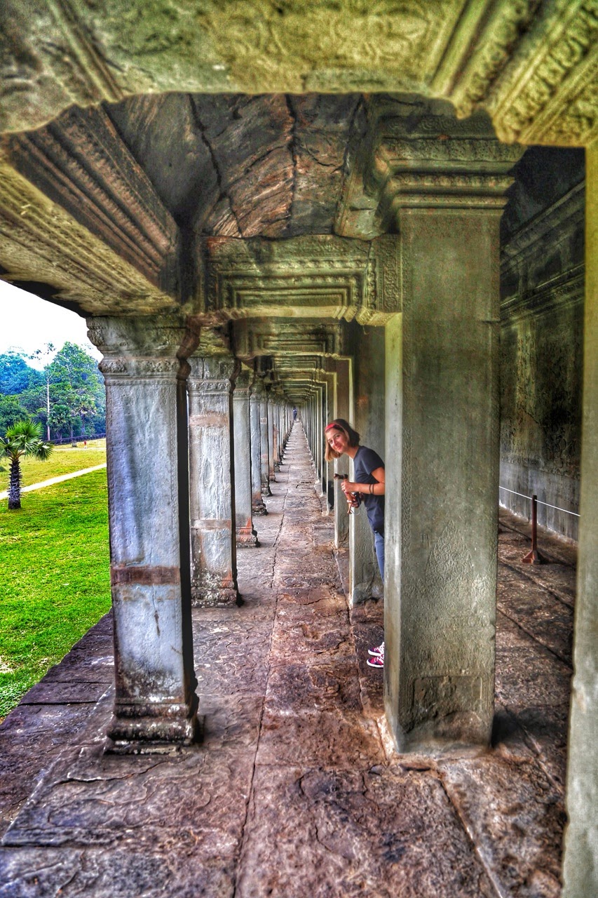 Et quelle enceinte… dont les remparts font 1025 m de long sur 800 m de large ! Avant d’arriver au complexe principal, il faut encore parcourir les 475 m d’une avenue de pavés bordée par des balustrades représentant d’interminables serpents naga à 7 têtes. De chaque côté on peut distinguer un bassin envahi par les nénuphars et une bibliothèque longiligne, dont celle au nord a été restaurée par une équipe japonaise. On découvrira bien plus tard que la plupart des sites a été rénovée, nettoyée ou est entretenue par des institutions ou des entreprises étrangères. Avec plus ou moins d’efficacité : dans les années 80 par exemple, des Indiens ont nettoyés les fresques avec des produits chimiques si acides que certains bas-reliefs (notamment les apsaras) ont été endommagés et ont dû être restaurés bien plus tard par des équipes allemandes. Excepté Angkot Wat, les autres temples ont été longtemps abandonnés aux éléments naturels… ou pillés !!