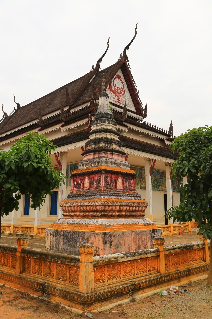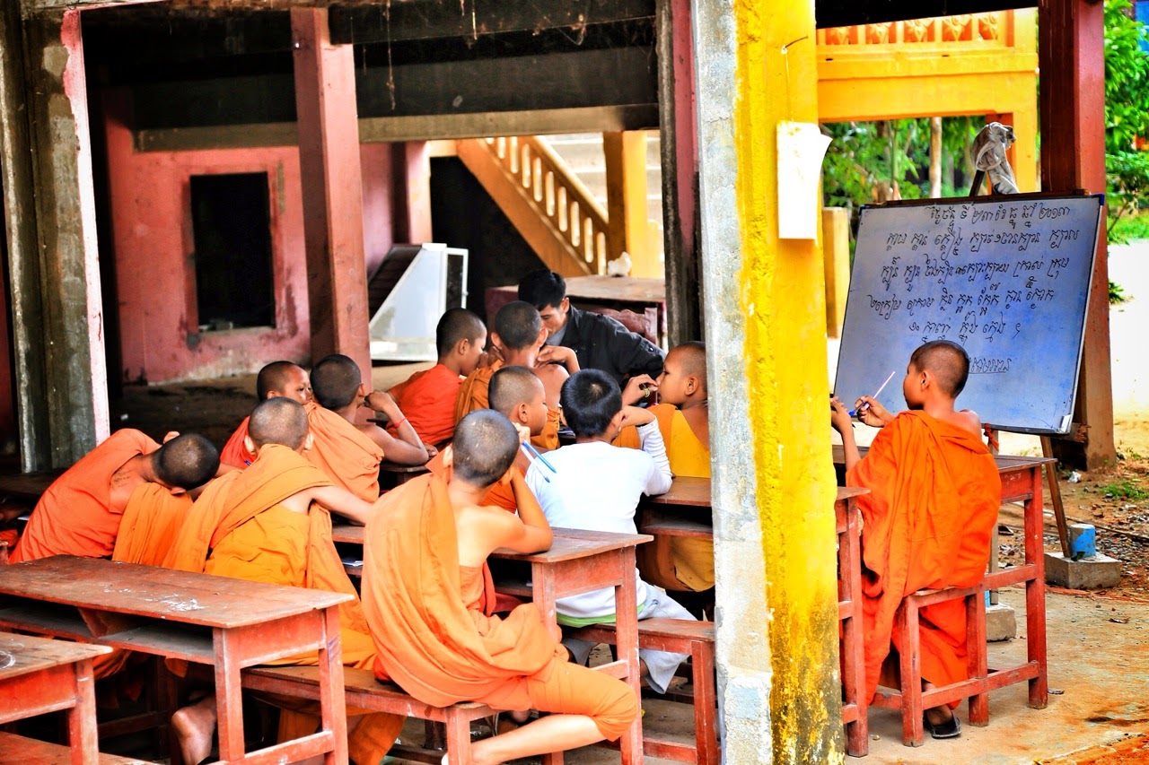 On a fait un détour par le modeste wat en activité au nord caché derrière les marchands de souvenirs et de bouffe où l’on a pu découvrir des plafonds hauts en couleurs et surprendre de jeunes bonzes à l’école.