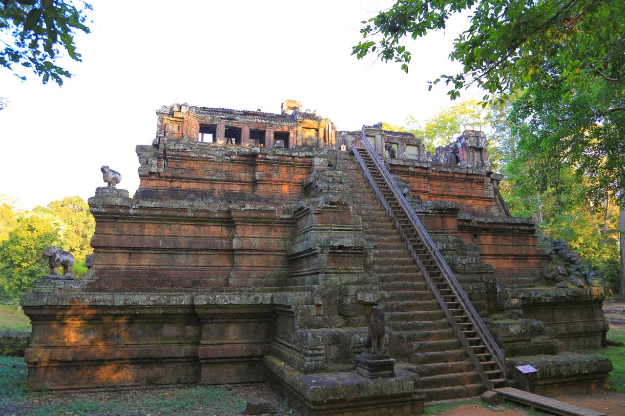 Même en utilisant un tuk-tuk pour les liaisons entre les monuments, on doit bien totaliser quelques bornes à pied en visitant les différents sanctuaires et, en cette fin de journée, la fatigue commence à se faire sentir. Vu le nombre d’escaliers, très raides de surcroît, les cuisses ont bien travaillé, bien mieux qu’une séance de PowerPlate ou de step ! Adèle m’abandonnera au pied du temple et je réunis mes dernières forces pour grimper sur la promenade du niveau supérieur située 43 m plus haut.