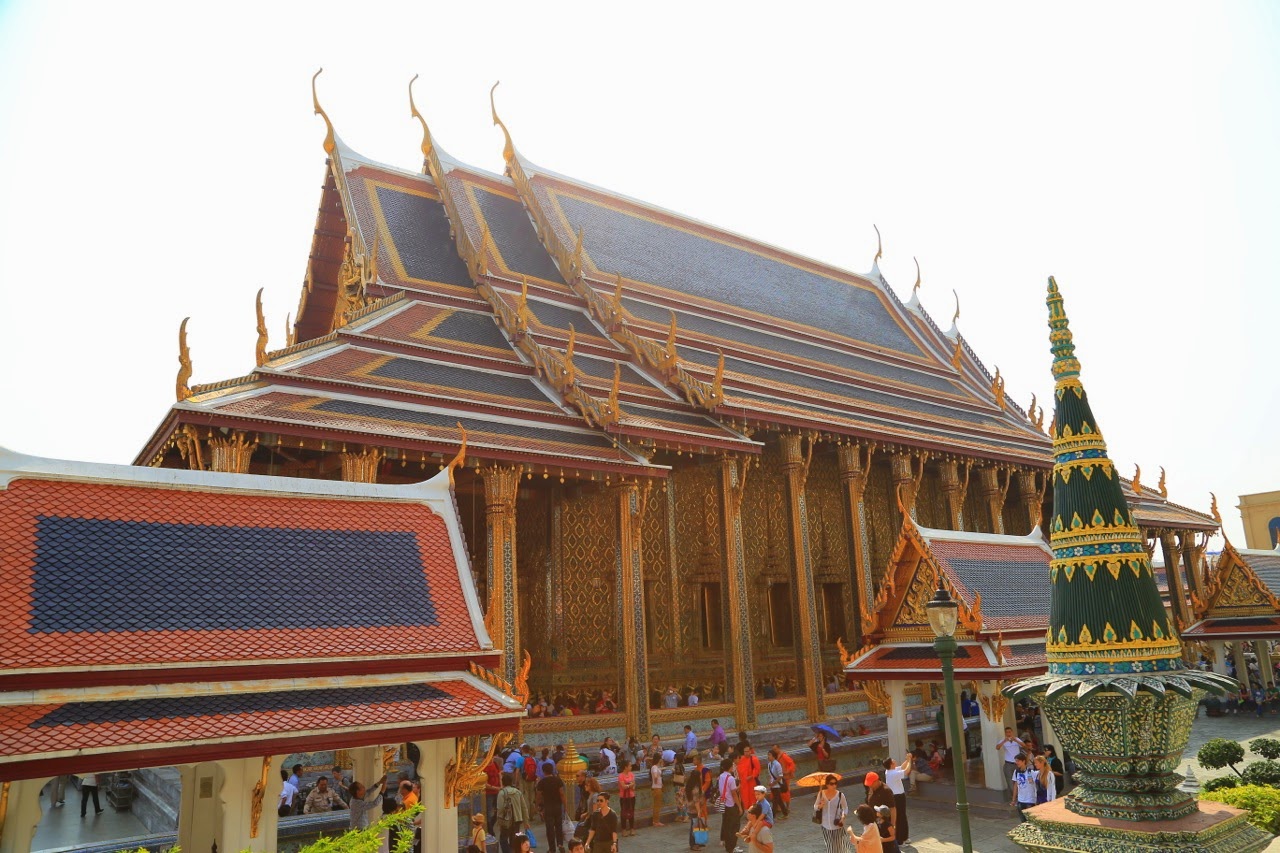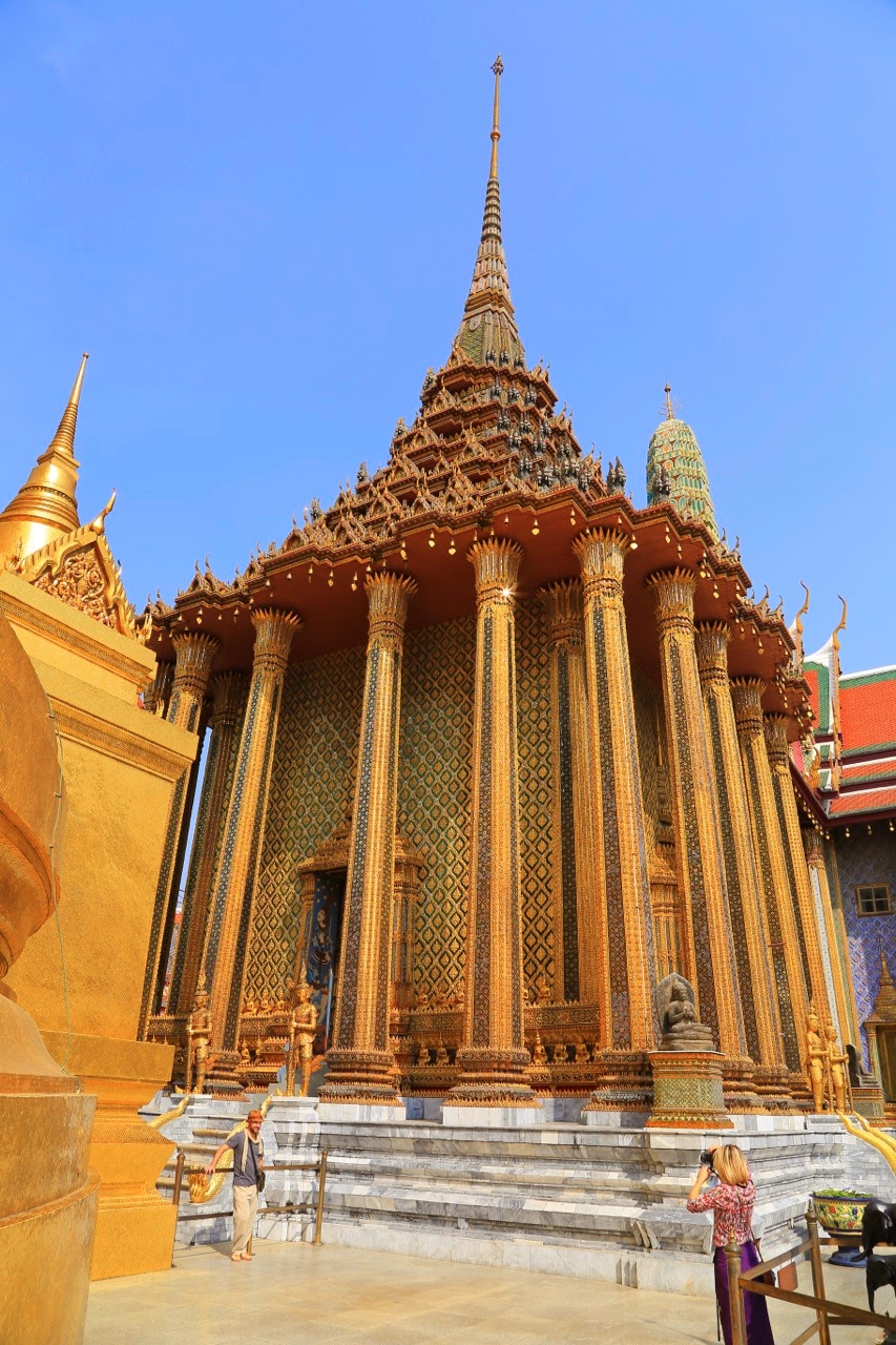 On arrive ensuite au Wat Phra Kaew qui abrite le fameux bouddha d’émeraude dont on suit la trace depuis Chiang Rai. Mais avant d’entrer dans le sanctuaire nos 2 amis devront emprunter une file interminable pour récupérer sarongs et baggy qui leur couvriront épaules et genoux. Un conseil : prévoyez le coup (emmenez une étole et mettez un pantalon avant) car non seulement il faut faire la queue sous une chaleur écrasante mais une fois arrivé au vestiaire, il faut encore attendre que des vêtements soient disponibles et restitués par les visiteurs sortants !