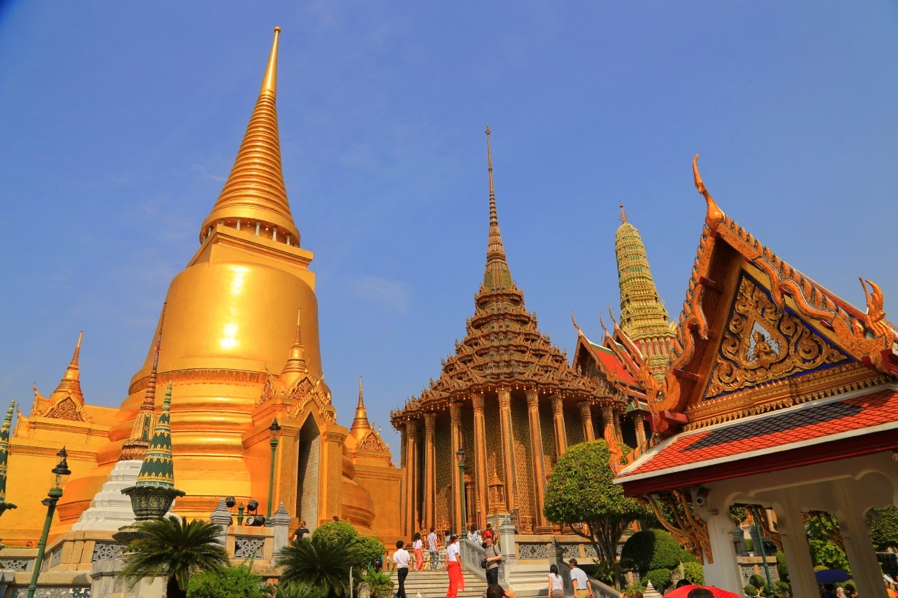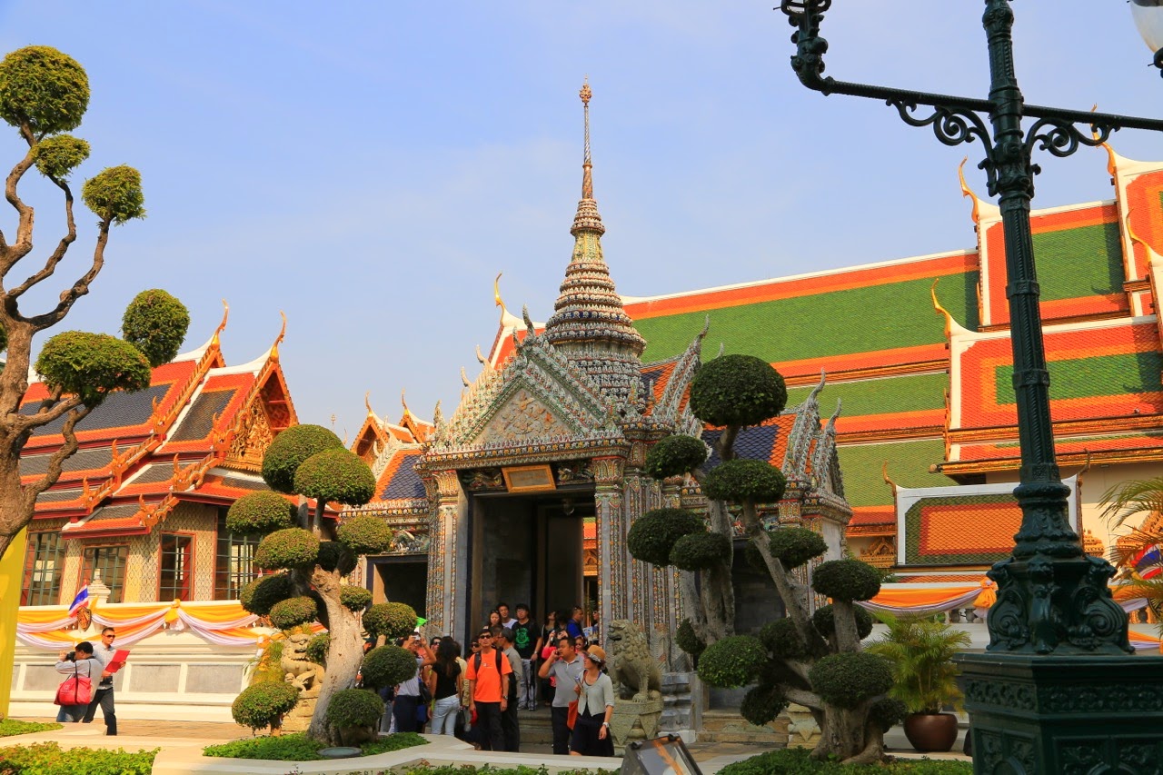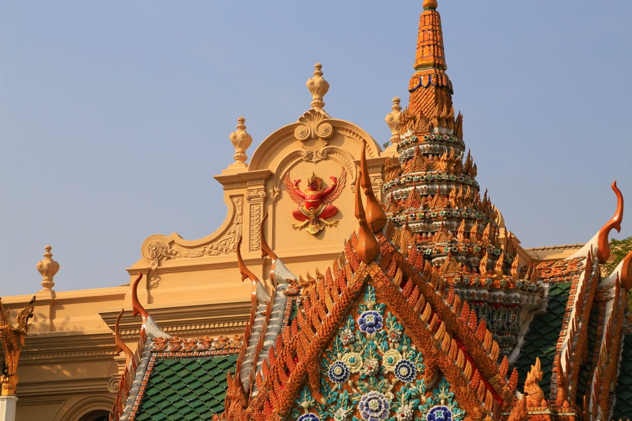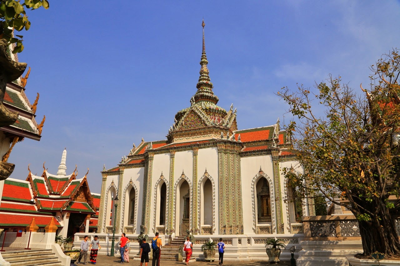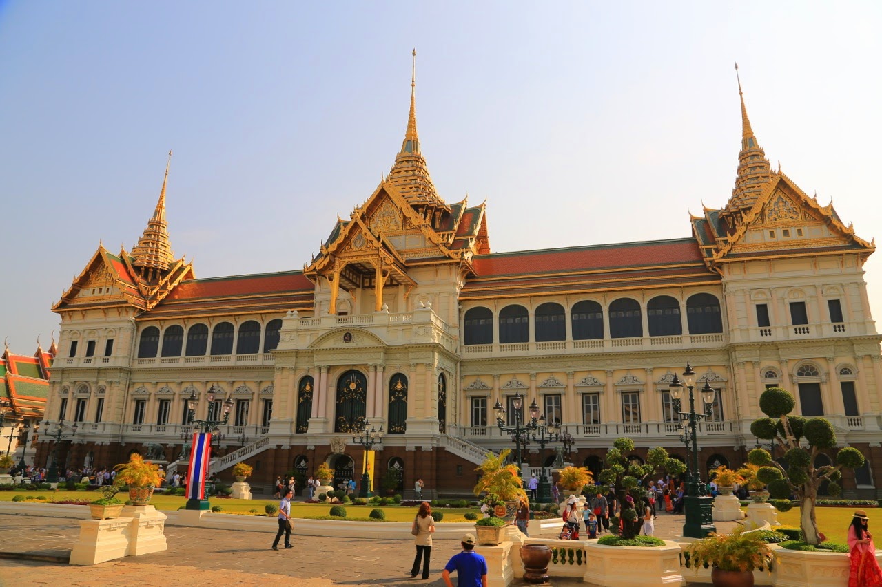 La visite se poursuit dans l’enceinte du Grand Palace par le Borombhiman Hall, d’inspiration française qui servit de résidence à Rama VI. Le bâtiment le plus étonnant reste Chakri Mahaprasat dont l’architecture mélange Renaissance italienne et style Thaï avec son toit rouge et vert surplombé par trois mondòpdorés (pagode) dont la centrale contient les cendres des rois Chakri (Rama de leur nom dynastique).
