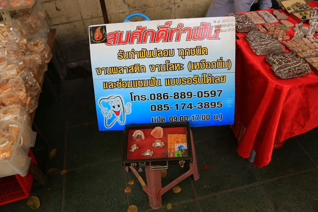 En chemin, on a pu admirer le Wat Arun situé sur la rive ouest du fleuve qu’on a prévu de visiter en fin d’après-midi. Après avoir débarqué du mauvais côté de la berge à Tha Phra Chan, nous obligeant à reprendre un bac pour traverser, on a pu entamer notre ballade improvisée la veille, dont le point de départ est le marché aux amulettes. Un endroit étonnement calme où les marchands n’essayent même pas de racoler le badaud ! On peut y observer des locaux qui examinent minutieusement, avec des loupes d’horloger, les détails et finesses de chaque pièce ! On y trouve évidemment des colliers et des talismans censés favoriser la santé, la réussite ou la fécondité mais également des reproductions des bouddhas du pays dont le fameux en émeraude… qui n’est en réalité qu’en jade ! Il y a également des statuettes de bonzes dans toutes les tailles possibles : “XXL“ pour les temples, “L“ pour son petit chez soi ou “XS“ pour son tableau de bord. Le marché continue dans la rue perpendiculaire avec des produits plus diversifiés comme de la bouffe, des bijoux fantaisie, des souvenirs mais aussi des dentiers !!