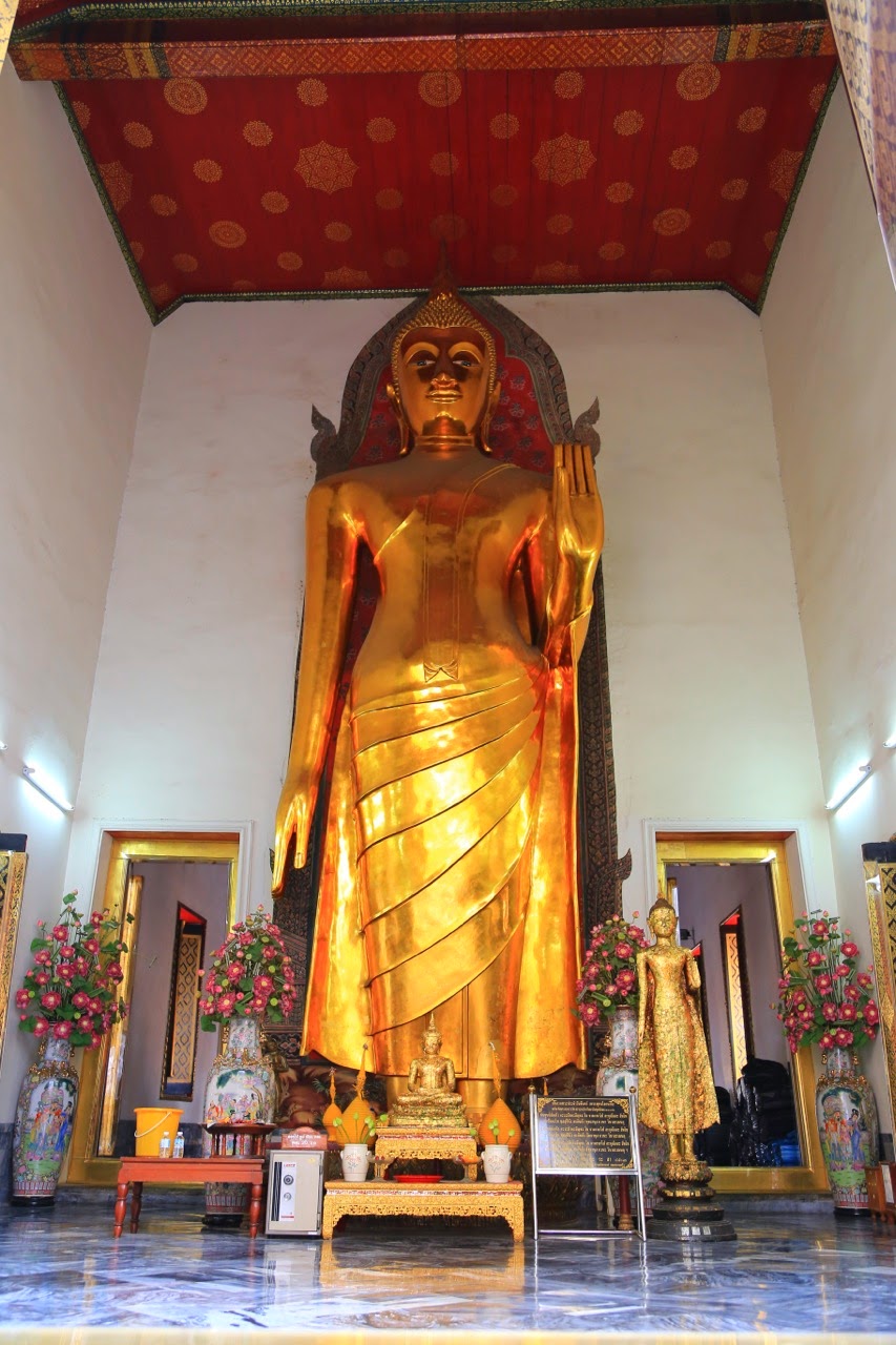 Dans le sanctuaire, on peut admirer une collection impressionnante de 394 bouddhas assis, autant dire qu’on ne s’est pas amusé à tous les regarder et dans le genre “jeu des 7 différences“, il y a également 91 petites stupas en commémoration des premiers rois de la dynastie Rama, réalisées en mosaïque colorée dont la pointe en cloche carrée est caractéristique du style Ratanakosin(souvenez-vous, c’est le nom du quartier !!).