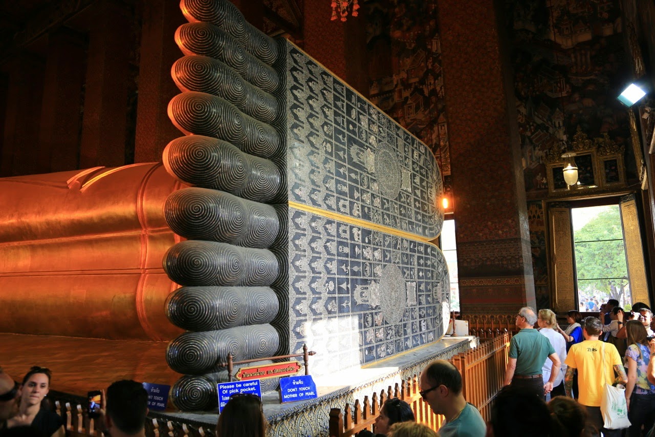 En sortant, on a longé le mur d’enceinte en passant devant les bâtiments du Ministère de la Défense avant d’arriver devant le Wat Pho qui contient le plus grand bouddha couché du pays ! Doré comme il se doit, il mesure 46 m de long, 15 m de haut et représente Bouddha lorsqu’il atteint le nirvâna (juste avant la mort) d’où la béatitude qu’on peut lire sur son énorme tête ! Les plantes des pieds sont décorées par les 108 láksànà, les caractères de Bouddha.