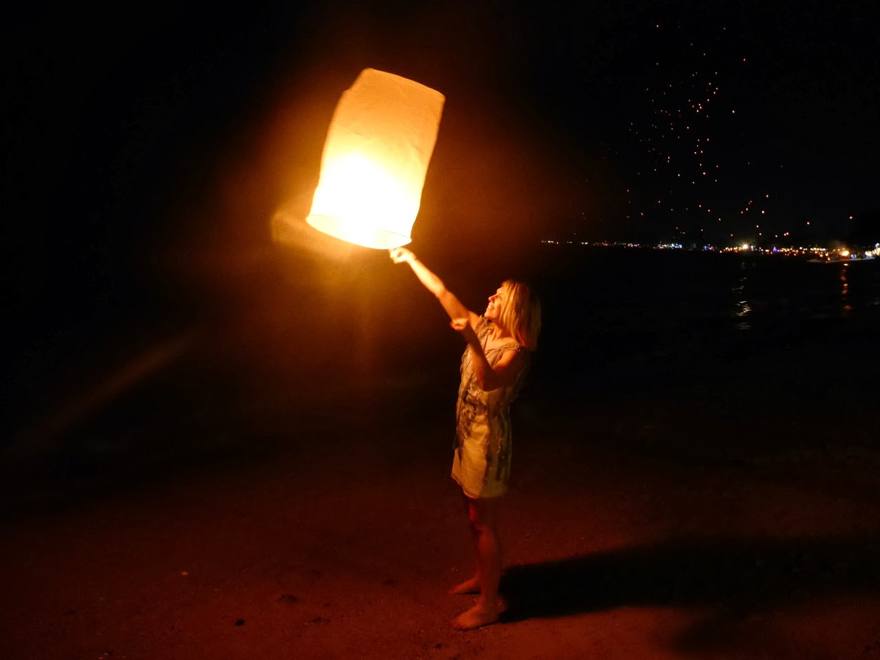 Malgré les nombreux restaurants et bars, Ban Lamaiest bien plus calme et moins fréquentée que Chaweng et pour trouver un restaurant sympa “les pieds dans l’eau“, rien ne vaut une marche nocturne le long de la plage. C’est ainsi qu’on a dégoté le New Hut dont les tarifs et la nourriture sont tout à fait corrects pour nos budgets. En mangeant, on peut déjà assister aux premiers lancements de lanternes célestes (Khoom Loy) qu’on s’est promis de faire le lendemain. Adèle et moi en voulions déjà à notre mariage mais la ville ne nous avait pas donné l’autorisation de balancer 130 lampions au-dessus du Rhin. Nous aurons donc notre revanche sur cette opposition administrative et pourrons enfin faire décoller ce symbole de chance ! En sortant, on réserve pour le réveillon et la patronne, qui semble avoir fumé des substances illicites, nous promet une fête d’enfer jusqu’à 4 ou 5h du mat’…