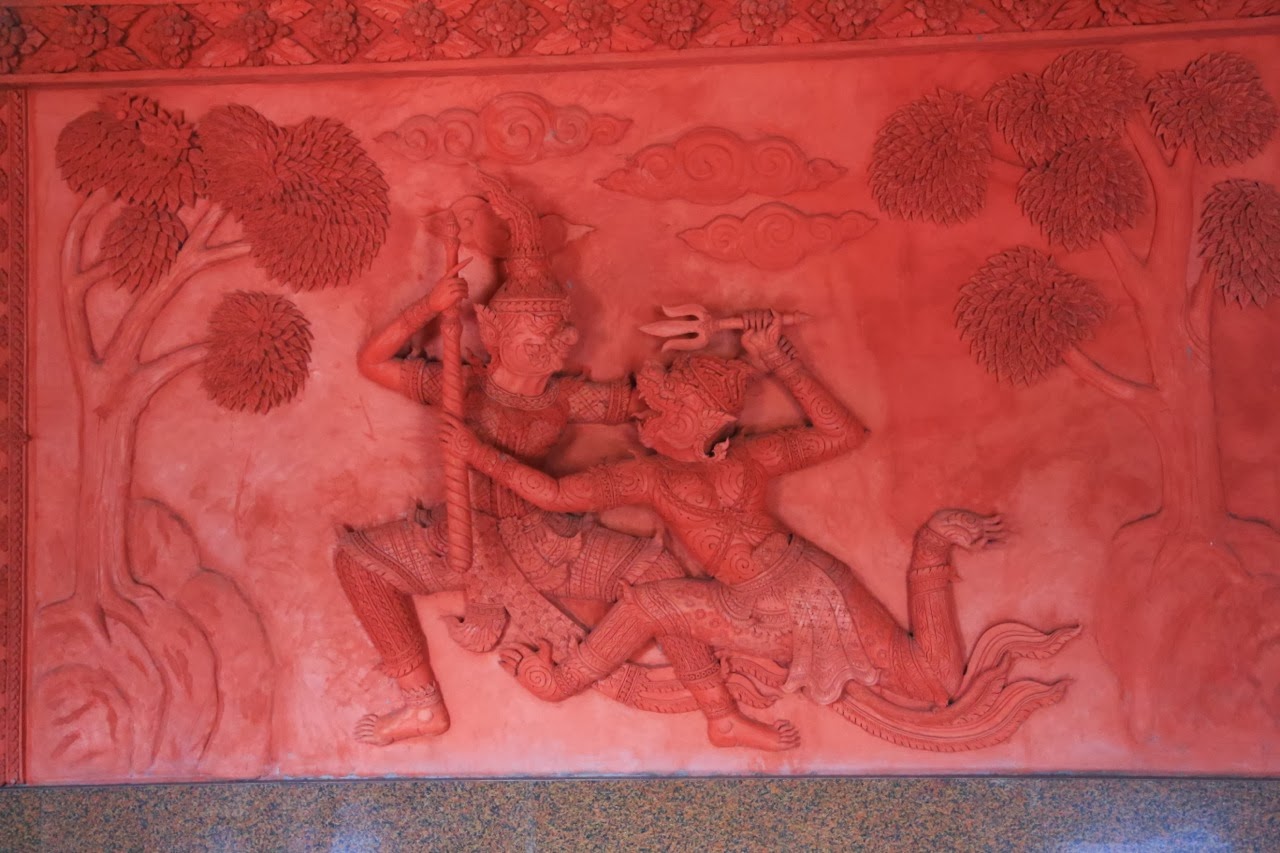 Sur le chemin du retour on s’arrêtera au wat situé juste en face de la petite fête foraine où nos amis avaient dégusté leurs bestioles. C’est un temple en cours de construction, totalement rouge et dont l’intérieur est entièrement modelé avec des personnages en relief. Je n’ai pas réussi à trouver son nom mais d’après les données GPS du reflex, il pourrait s’agir du Wat Sila Ngu. Nous pensions être blasés des temples et là où nous nous y attendions le moins, voilà qu’on tombe par un hasard sur un spécimen original et tout à fait inédit dans notre périple en Thaïlande !