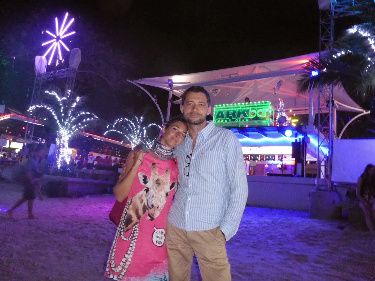 Le premier de l’An fut décrété journée libre pour tout le monde et la joyeuse bande ne s’est réunie que le soir pour monter jusqu’à Chaweng. On a pu découvrir une bourgade totalement différente de notre coin paisible avec des rues très animées grâce à une succession de concept de restaurants et de bars branchés. Notre belge, tenancier de bar près de Laem Hin Khom, nous avait conseillé l’ARK barque Gilles a trouvé par hasard en garant son scooter. On décida d’y boire un verre et on fit un bon dans le temps de 10 ou 15 ans en arrière, avec l’impression de retrouver l’ambiance de nos fêtes d’étudiants ! Le bar où plutôt LES bars sont gigantesques et s’étendent sur une bonne partie de la plage jusque dans l’eau, avec un DJ sur une plateforme qui balance du bon son pour bouger son “booty“. Les tables sont remplies de guys bodybuildés en maillot de bain et tongs qui descendent des fontaines de bière. Au début, on s’effraie quand l’un d’eux monte sur la table et hurle tel l’australopithèque de Gad Elmaleh mais après 2 ou 3 fois, on s’habitue et on ne se retourne même plus.