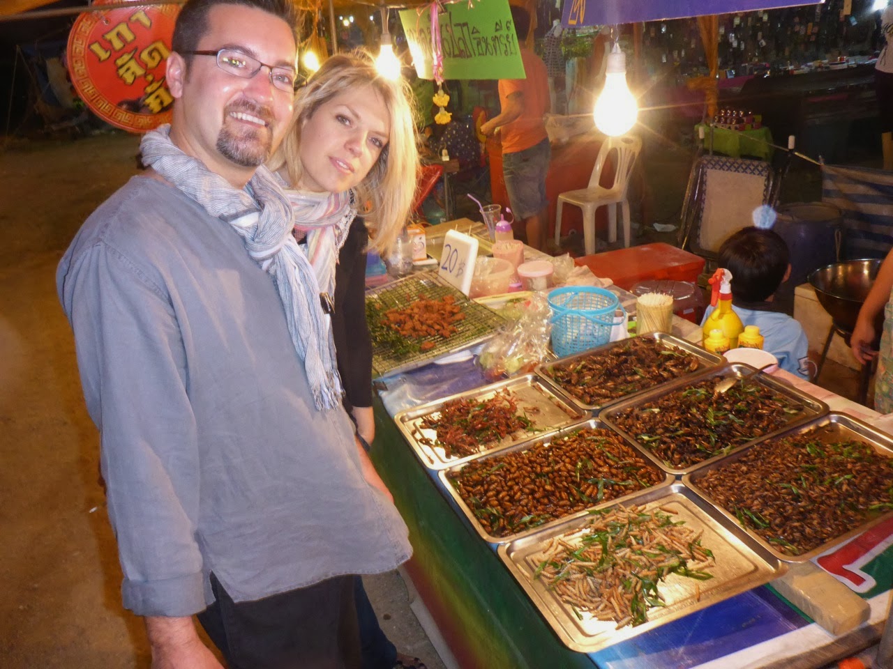 Adèle nous avait trouvé un petit resort de 18 bungalows sur la confidentielle plage de Silver Beach, éloignée d’1 km seulement de la longue Hat Lamai. A l’hôtel, on a loué 2 scooters et on a fait un petit tour de reconnaissance afin de trouver un endroit sympa pour passer le réveillon de la Saint-Sylvestre. On a fait un petit stop dans une sorte de fête foraine où nos 2 amis ont pu goûter à un peu d’exotisme avec des chenilles et des grillons grillés !