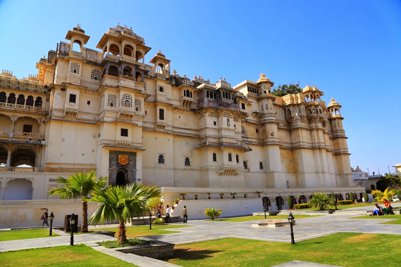 Lac Pichola. La cour est grandiose avec ses murs blancs et ses carrelages en damier. Le