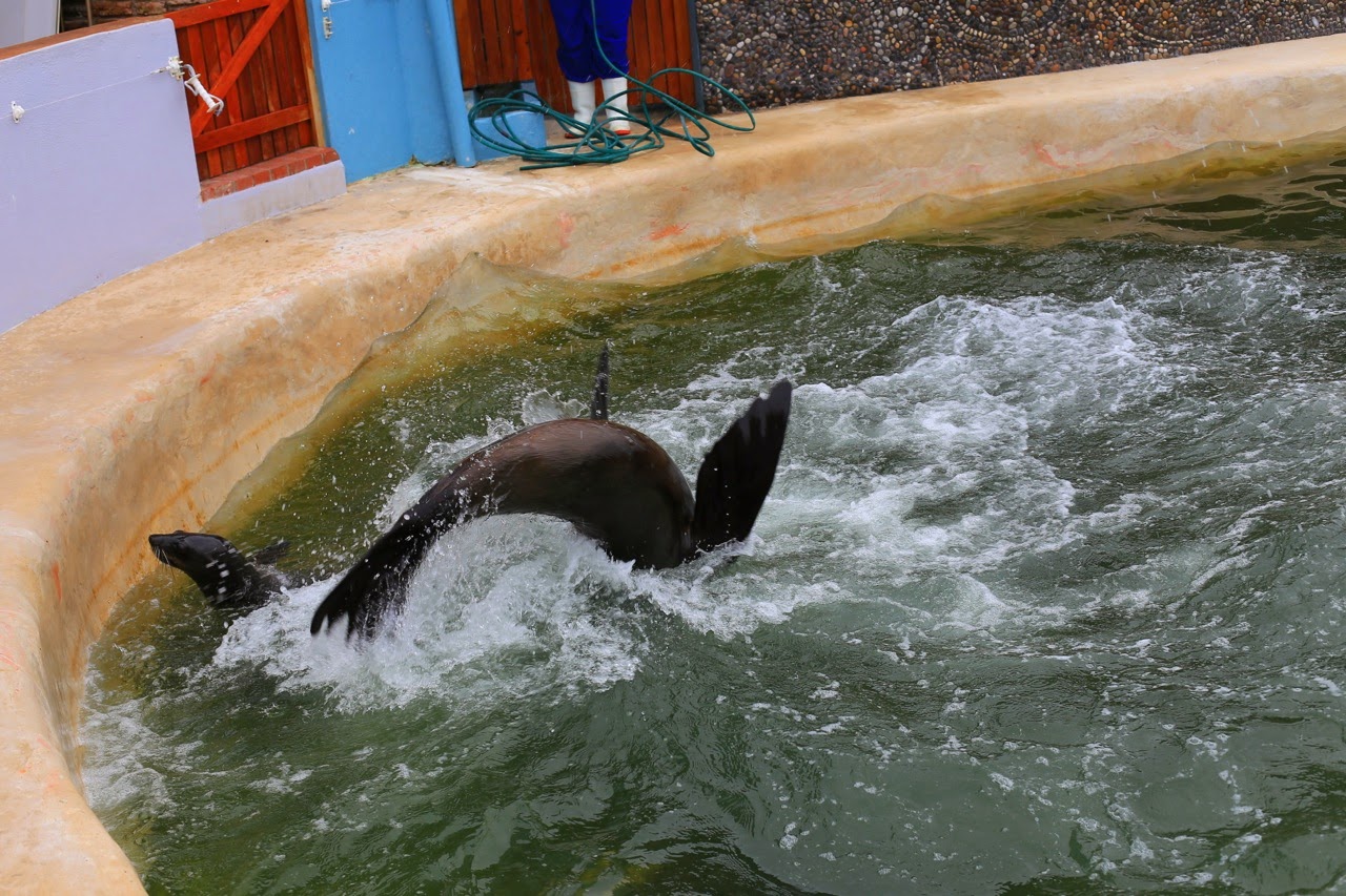 On passe ensuite le reste de l’après-midi à Bayworld qui, outre un oceanarium un peu défraîchi, comporte un snake parkmais surtout le très vaste Port Elisabeth Museum qui nous apprend tout sur la faune et la flore de la région en passant par l’histoire de l’océan et de ses marins. Ce musée d’histoires naturelles est très intéressant, surtout pour des enfants, et on y passera finalement près de 3h, en comptant la petite représentation privée à laquelle nous avons eu le droit de la part des phoques qui font les clowns au milieu des tortues pour quémander quelques poissons à la jeune équipe d’animation. Etant le seul public de ce show, une employée joue les guides rien que pour nous et nous présente toute la petite famille qui se donne en spectacle. Plus loin, des pingouins s’ennuient devant leur bassin vide pour cause de nettoyage.