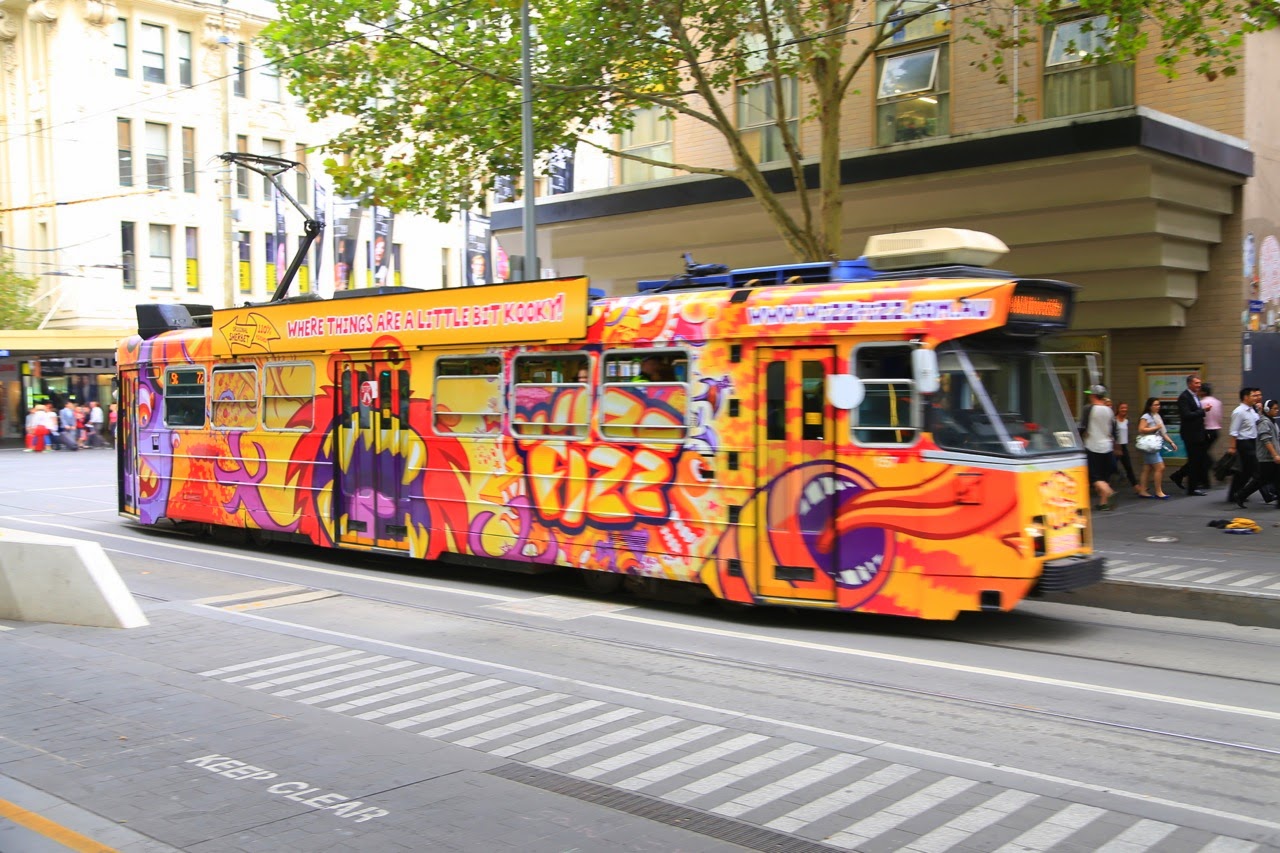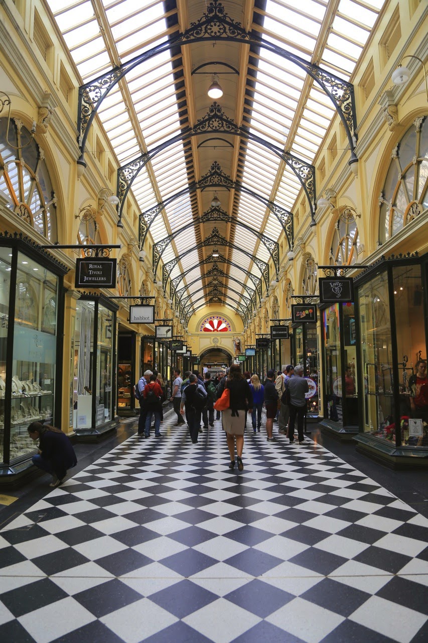 Comme à notre habitude, on quadrille le centre ville à pied mais également aidé par le vieux tram W-Classdatant des années 50, toujours en service, icône de la ville et qui fait une boucle ceinturant le CBD (central business district). Comme à Sydney, il y a beaucoup de galeries marchandes historiques comme Block Arcade, Royal Arcade, Australia on Collins ou David Jones. N’ayant vraiment plus de place dans nos sacs à dos pour faire du shopping, on les arpente avec bonheur pour aller d’une rue à l’autre en admirant leurs verrières.