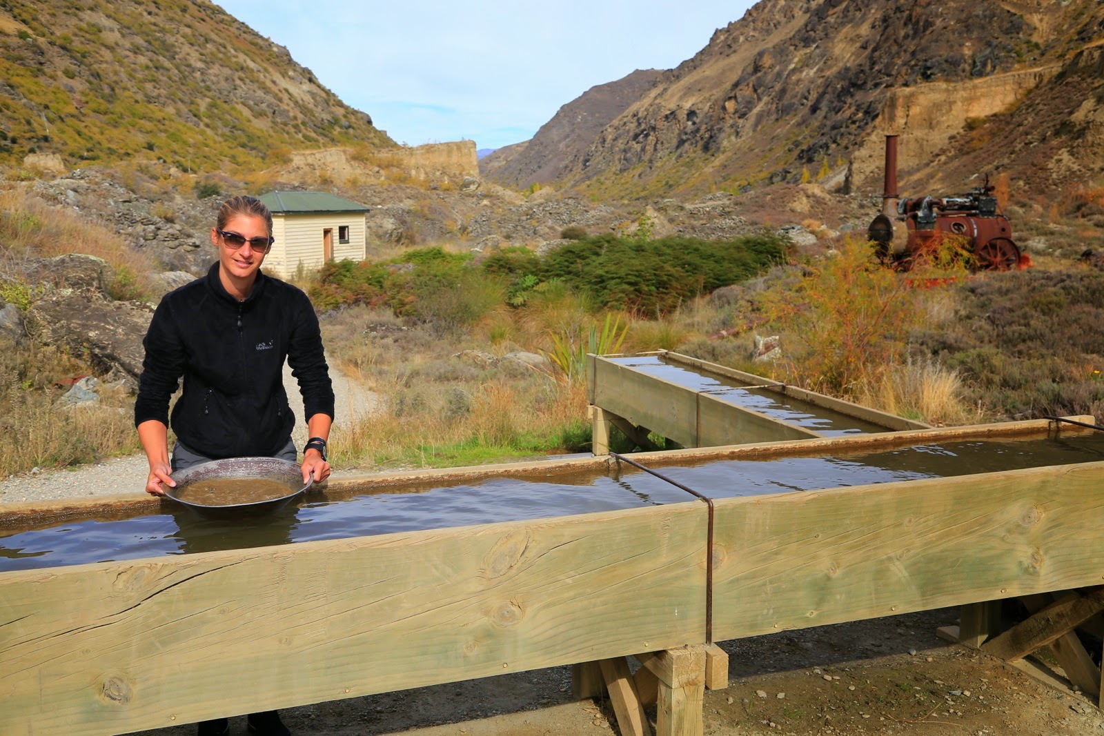 On reprend notre route et on commence à traverser des collines aussi verdoyantes que des fairways ! Les paysages ressemblent de plus en plus à des scènes du Seigneur des Anneaux. On fait un stop pour visiter une mine d’or où, en prime du cours d’histoire et de la petite marche dans la montagne, on a le droit à une leçon pour trouver le précieux métal dans les graviers issus de la rivière vert turquoise juste en-dessous. Adèle se révèle adroite dans la manipulation délicate de la gamelle de métal où il faut agiter les cailloux avec de l’eau et des billes de plomb. Aidée de notre vieux guide, retraité de la mine, elle trouve une paillette au fond de son récipient.